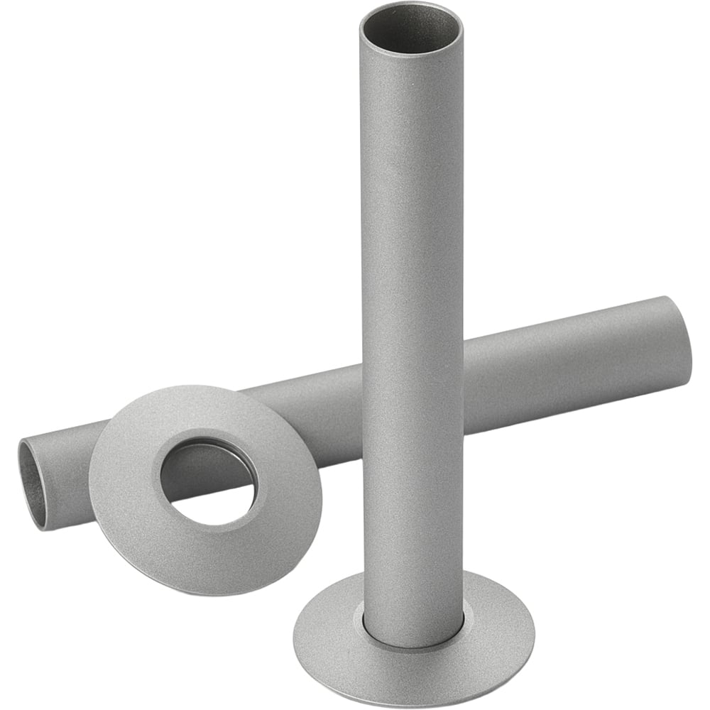 Pipe masking set - to cover the exit point for your valves from the wall and into the back of your radiator. Gives the perfect finish with a collars to sit around the pipes where they come out of the wall and pipes to sleeve your cooper pipes within. Match these with the CYLINDRICAL or TRADITIONAL valves ranges from Terma. Pipes are 130mm in Length, 18mm in diameter (16.5mm internal diameter) so will sleeve over 15, 10 or 8 mm diameter copper pipework. Collars are 44mm Diameter. Matt Grey in colour.