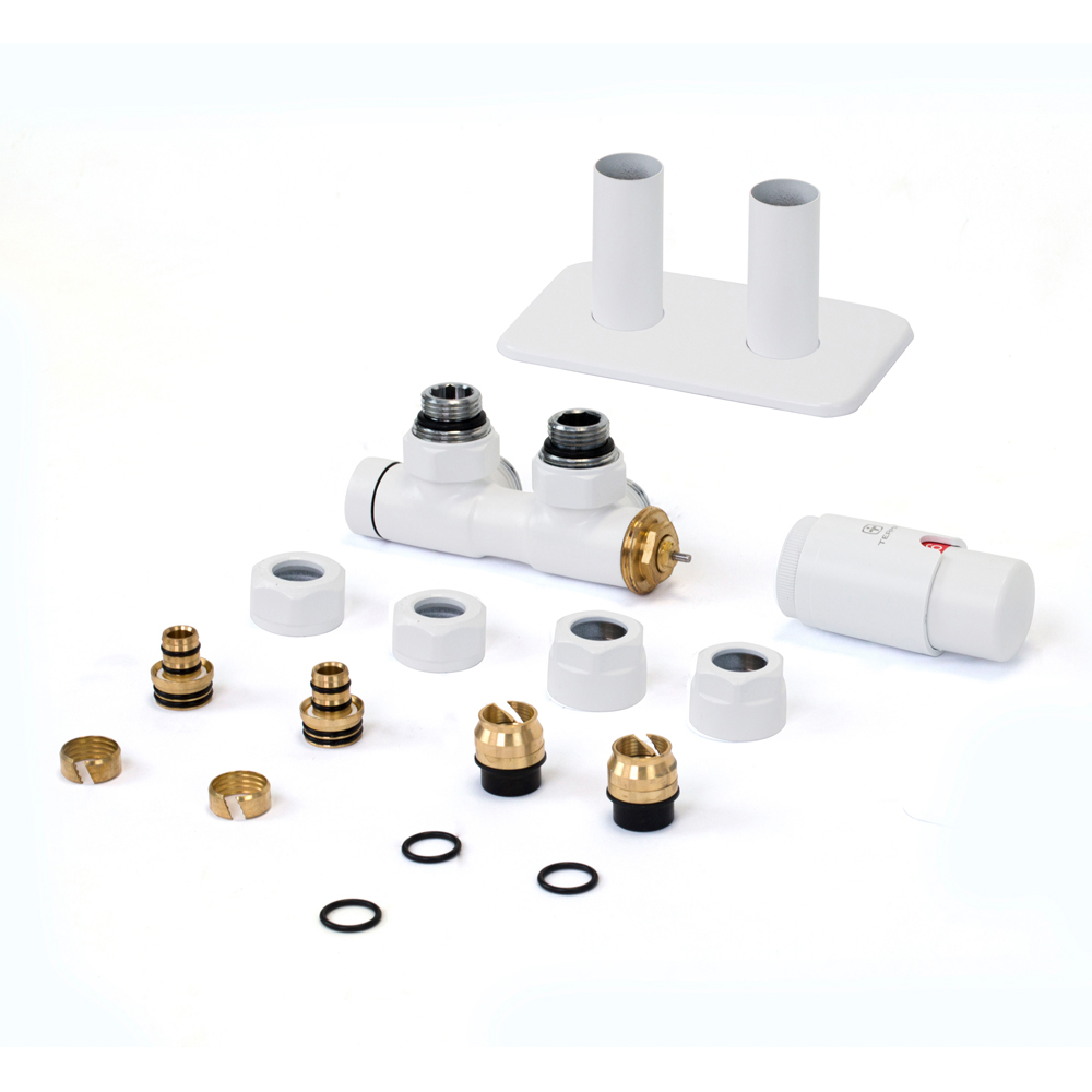 The TWINS sets of valves come complete with 50mm connection valves and a 50mm pipe masking set - all produced in the matching colour to your radiator with the same 50mm connections. These valves are specially stocked to pair with any radiator with 50mm connections (i.e. Hex) manufactured in the same colour to achieve an overall matching finish head to toe. Angled orientation and right sided (with the TRV head on the right hand side of the product and the body of the valve on the left side). The Soft 9016 (Matt White) colour has a matt, smooth finish. Full contents list: 1x Coloured integrated thermostatic valve body (to fit a radiator with 50mm pipe centres), 1x Coloured Plastic/Brass Thermostatic head, 2x Coloured Nut for multilayer pipe adapter, 2x Coloured Nut for copper pipe adapter, 2x Coloured 50mm Pipes, 1x Coloured Steel/Brass Wall Masking Cover with 2 Holes, 2x Brass Nipple for multilayer pipe adapter, 2x Brass Clamping ring for multilayer pipe adapter, 2x Brass Copper pipe adapter sealing kit Note: The Vario valves are not bi-directional - therefore you need to select the correct left or right orientation based on the location of the TRV head and the flow as these should be on the same side.