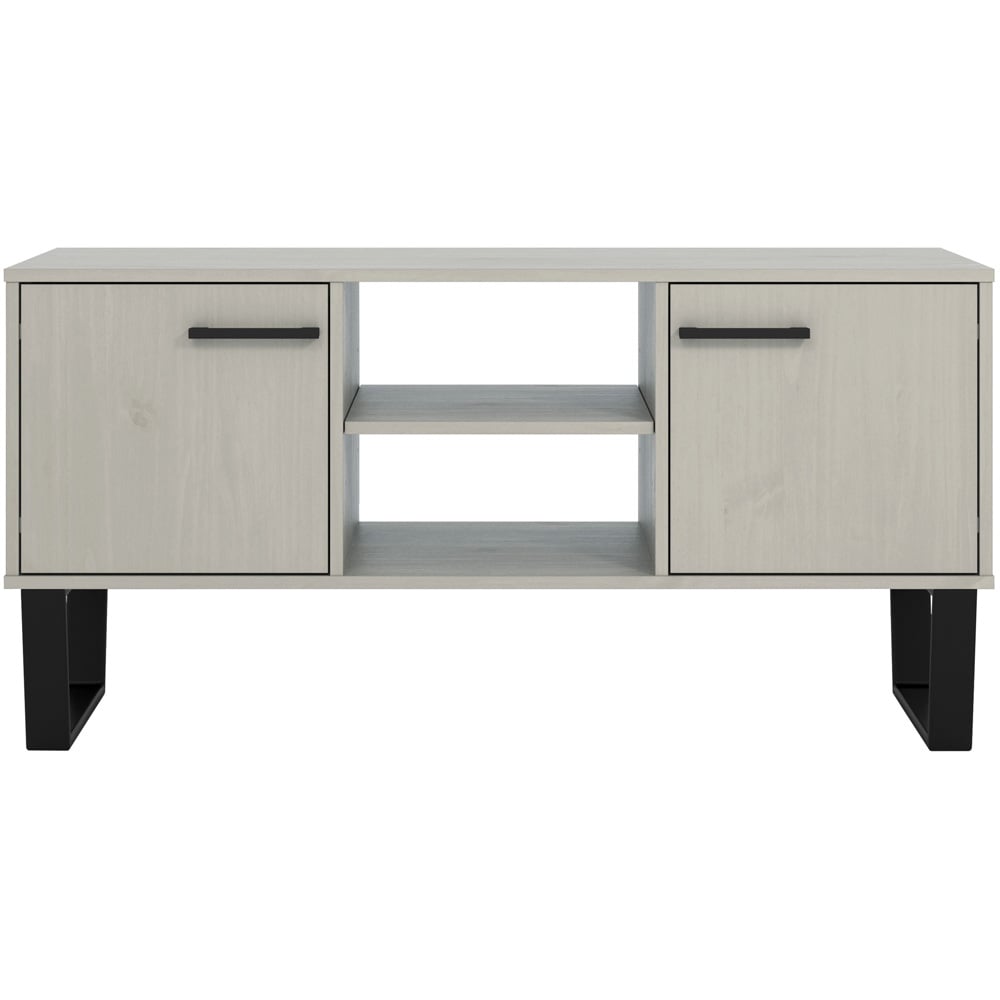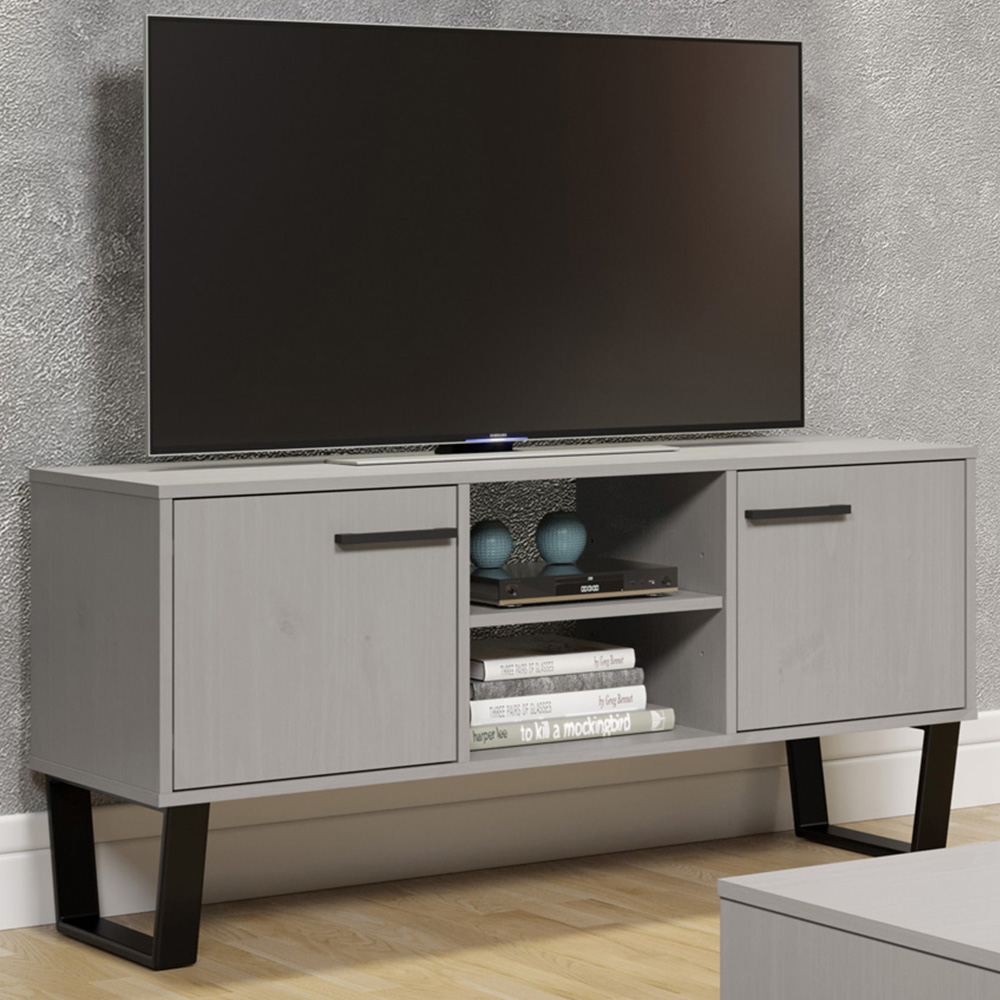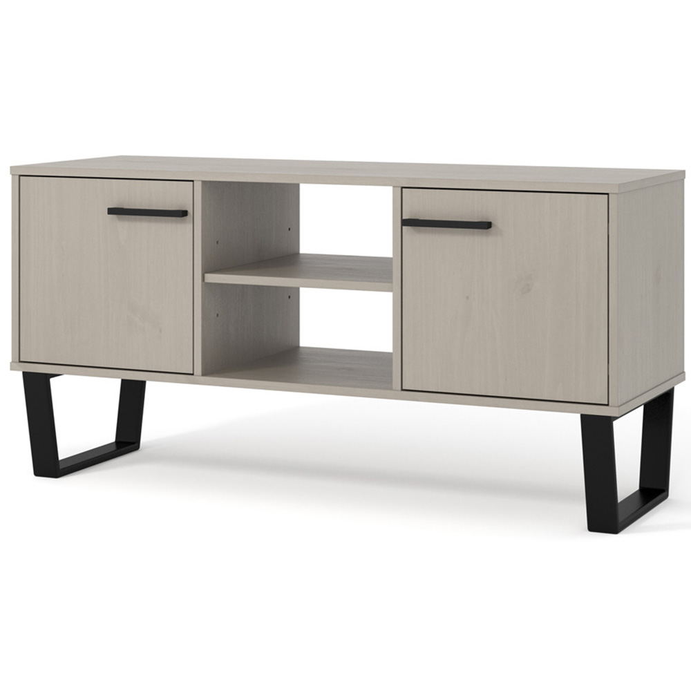 The Texas wide-screen TV unit is made from pine timber, which is sourced from plantation forests, making it an environmentally friendly piece of furniture. The TV unit has a 16mm top with a grey waxed finish, which lets the character of the wood show through. Being 114cm wide, this unit can take a wide-screen TV up to 42 inches with ease. The chunky industrial design metal legs that are black stove painted and the black pull handles all complement each other well. The unit has two cupboard doors at each end and an open central space with a shelf, which gives the unit plenty of space for storing media devices and game consoles.