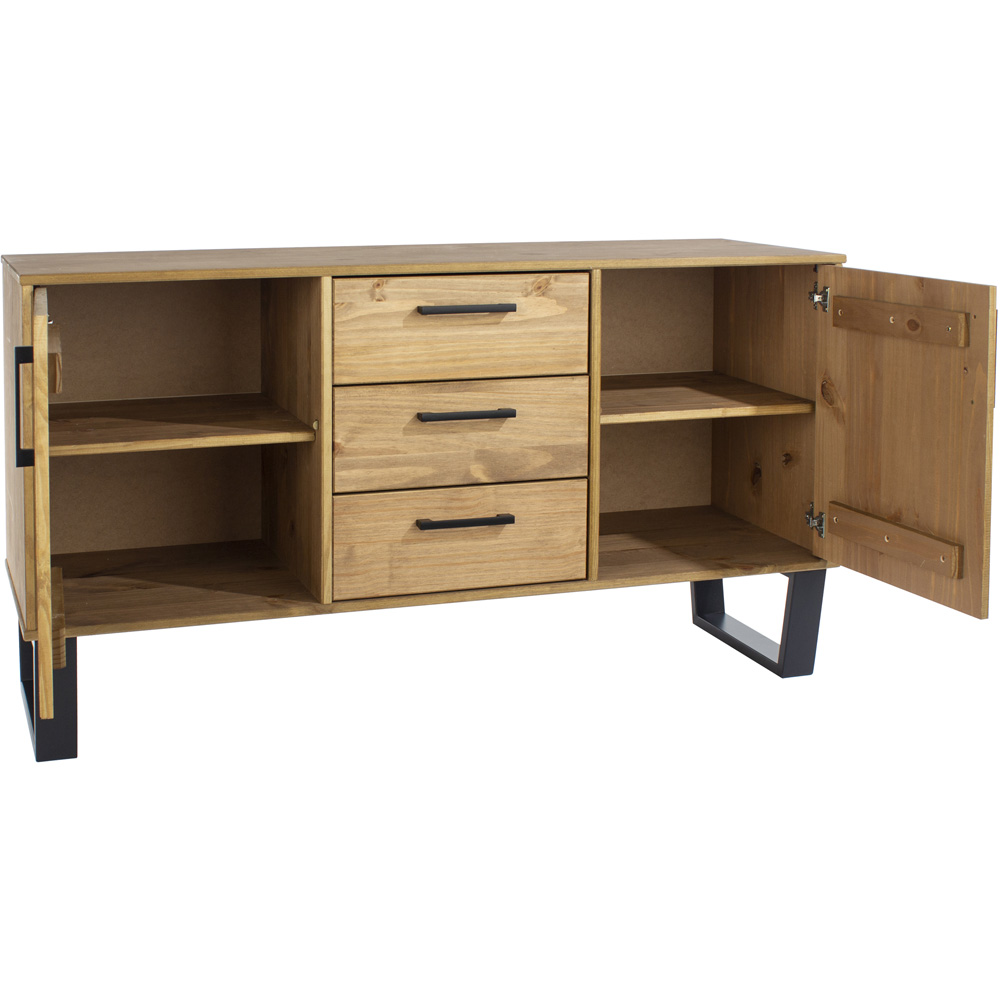 Make a rustic addition to your home decor with the Texas 2 Door 3 Drawer Medium Sideboard. The Texas large sideboard is made from pine timber, which is sourced from plantation forests, making it an environmentally friendly piece of furniture. It's finished with a rich antique wax finish, which lets the wood show through. The black metal legs and pull handles all look great together and make the furniture look modern, giving it an industrial design. The unit sits on the legs, making it easy to clean under it. The sideboard has two cupboard sections at each end and three large drawers in the centre. The cupboard has an adjustable internal shelf, making it ideal for storing pots and dishes. The drawers provide enough space for your cutlery, placemats and tableware. The unit top is 130cm wide. It offers plenty of space for lamps, ornaments, and pictures, making it a lovely piece of furniture for your dining room, living room or hallway.