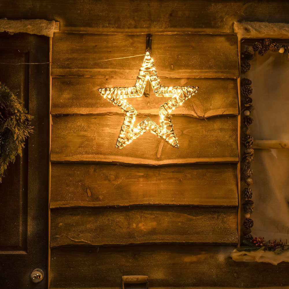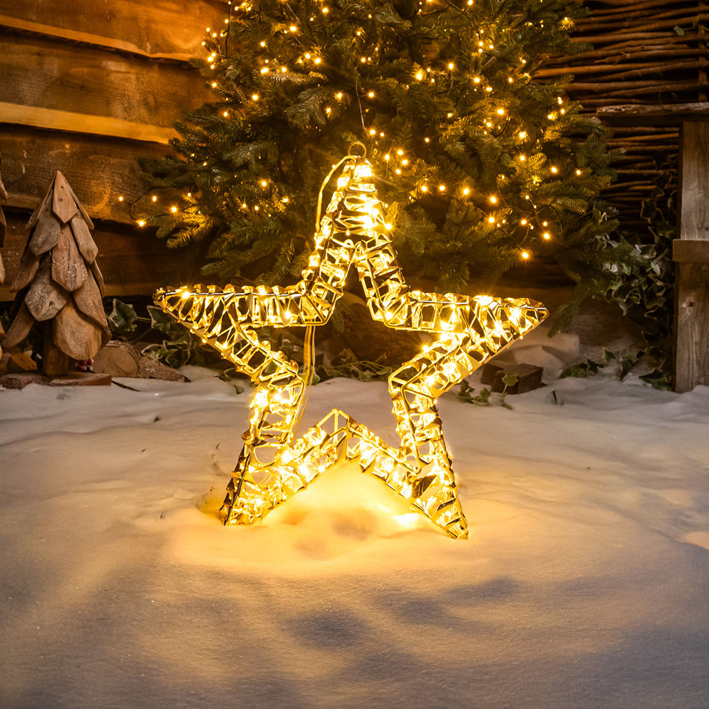 Bring a magical twinkle to your festive displays with a radiant gold star that dazzles with 120 warm white LEDs and a shimmering laser-effect finish, perfect for creating a captivating centrepiece indoors or outdoors. The glittering gold metal frame, wrapped in gold plastic strip, pairs with a subtle 10% flashing effect to deliver timeless sparkle while the clear ten-metre cable and indoor transformer make placement easy. An eight-hour on, 16-hour off timer ensures your pre-lit gold Christmas star tree topper 40cm with warm white LEDs glows effortlessly throughout the season, adding warmth and charm wherever it's displayed.