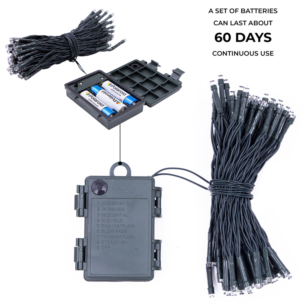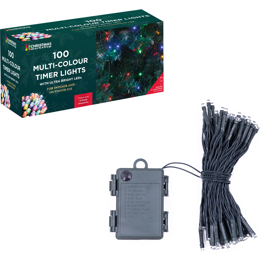 Add a gorgeous touch to your decor with The Christmas Workshop 100 LED Multi Colour Battery Operated Light. These LED Christmas lights provide optimal illumination for both Christmas trees and outdoor spaces, and will guarantee a warm, festive feel to your home once in place. The Christmas lights feature 8 separate modes which let you decipher the kind of mood you want to set. Choose between Combination, Sequential, Chaser Flashing, Twinkle Flashing, Waves, Slow Glow, Slow Fade and Steady On modes, all of which will deliver a truly unique experience. These Christmas fairy lights are equally adept for decorating your home, as well as the Christmas tree and your outdoor spaces. Wrap them around mirrors, staircases, and doorframes, or even drape them in windows, illuminating your festive spirit out to the other people who live on your street. The fairy lights have a timer mode which allows for 6 hours of uninterrupted illumination, before turning themselves off for the remaining 18 hours of the day. These Christmas tree lights are battery-operated and require three AA batteries (not included), and once inserted will illuminate your family home for years to come. The lights cover an impressive 9.9 metres, allowing you to cover great distances with these bright flashing multi-coloured Christmas lights.
