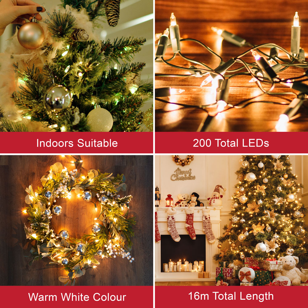 Let the festive spirit shine brightly in your home with The Christmas Workshop 200 Clear Shadeless Fairy Light. With 200 multi-coloured light bulbs, this warm white string-style Christmas tree light is ideal for anyone looking to create a cosy and sophisticated holiday atmosphere. The warm white glow gives your Christmas tree and other decorations an elegant touch, sparkling just enough to make them the centrepiece of your overall decoration. Measuring 15.9 metres in length, this fairy light offers sufficient coverage for your tree. Apart from the tree, you can also hang it around bannisters, above fireplaces, around mirrors or even around in front windows to share your festive spirit with the rest of the world. It also offers a 1.5-metre gap between the plug and the first bulb, ensuring an easy setup with a seamless transition from socket to decoration. The shadeless design ensures a bright and consistent glow, no matter how you arrange it. Once Christmas is over, this light can be used to decorate wedding venues, birthday parties, and any other celebrations where soft, decorative lighting is needed. Energy-efficient and versatile, this light is designed to last and will keep your home glowing through all your festive celebrations and beyond.