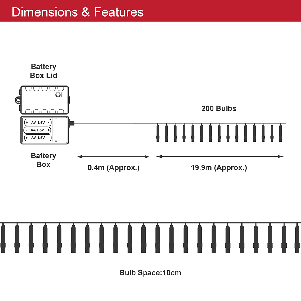 Add a gorgeous touch to your decor with The Christmas Workshop 200 LED White Battery Operated Light. These LED Christmas lights provide optimal illumination for both Christmas trees and outdoor spaces, and will guarantee a warm, festive feel to your home once in place. The Christmas lights feature 8 separate modes which let you decipher the kind of mood you want to set. Choose between Combination, Sequential, Chaser Flashing, Twinkle Flashing, Waves, Slow Glow, Slow Fade and Steady On modes, all of which will deliver a truly unique experience. These Christmas fairy lights are equally adept for decorating your home, as well as the Christmas tree and your outdoor spaces. Wrap them around mirrors, staircases, and doorframes, or even drape them in windows, illuminating your festive spirit out to the other people who live on your street. The fairy lights have a timer mode which allows for 6 hours of uninterrupted illumination, before turning themselves off for the remaining 18 hours of the day. These Christmas tree lights are battery-operated and require three AA batteries (not included), and once inserted will illuminate your family home for years to come. The lights cover an impressive 19.9 metres, allowing you to cover great distances with these bright flashing multi-coloured Christmas lights.