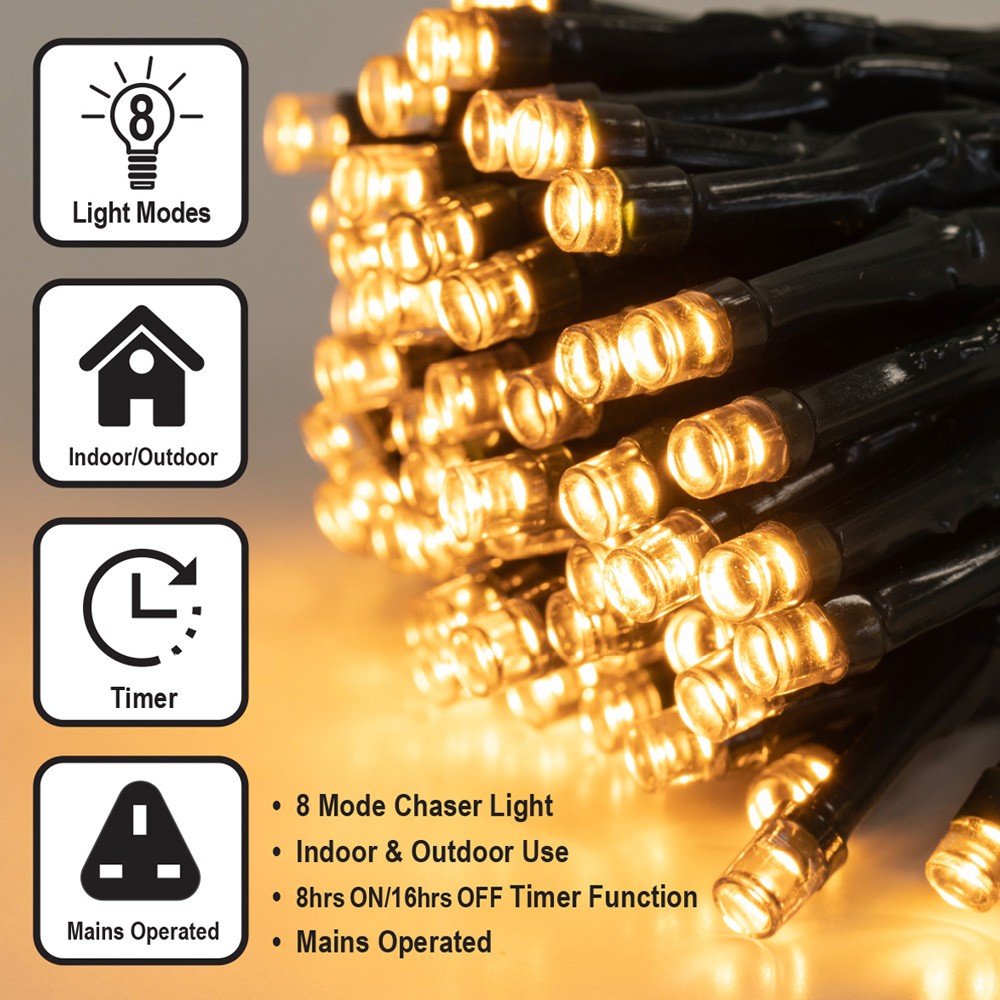Awaken the festive spirit in every corner of your home with The Christmas Workshop 200 Warm Gold LED Plug In Chaser and Timer Light. Spanning an impressive 13.9 metres, this warm gold light with 200 LED bulbs offers sufficient length to brighten up both indoor and outdoor spaces. The first flashing bulb is positioned a generous five metres from the main box, giving you flexibility in your setup. With eight different light settings including combination, sequential, chaser flashing, twinkle flashing, waves, slow glow, slow fade and steady on, you can customise the ambience to suit any occasion. Plus, it features a practical timer function. It stays on for eight hours and then automatically turns off for the remaining 16 hours of the day, ensuring energy efficiency and convenience. Ideal for decorating Christmas trees, living rooms, bannisters, window frames and outdoor spaces, this multi-functional light is a great option for creating a festive environment. In addition, it is also a great option for special occasions like weddings, birthdays, bedrooms, or any other scenario where illumination is needed. Please note that the mains unit should always be kept indoors and dry, even when the lights are used outdoors. With its versatile modes and warm glow, this chaser light provides the perfect solution for all your festive decorating needs.