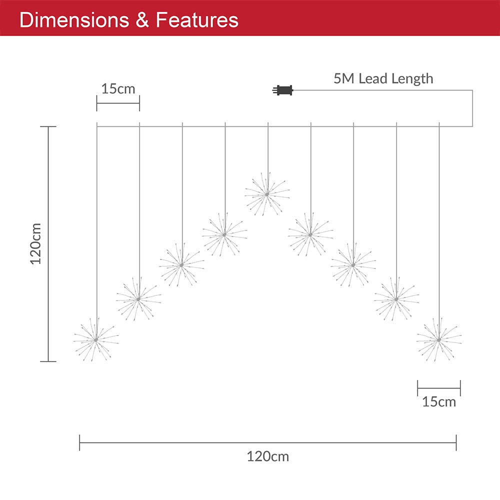 Uplift your festive décor with The Christmas Workshop 360 Warm White LED V Shape Starburst Curtain Light. This enchanting light is ideal for window displays and features nine individual V-shaped starbursts, each with a diameter of approximately 15cm. This light glows in a cosy warm white colour, creating a calming atmosphere that will attract everyone around. Each starburst is equipped with 40 LEDs, adding up to a total of 360 LEDs that provide ample illumination. The V-shaped pattern makes the light ideal for hanging over window and door frames, lighting up both the inside and outside of your home. Designed to be versatile, this light can also be used outdoors, thanks to its IP44 waterproof rating. It comes with a 5-meter-long lead wire for easy placement and is powered by a mains adaptor, which must be always kept indoors.