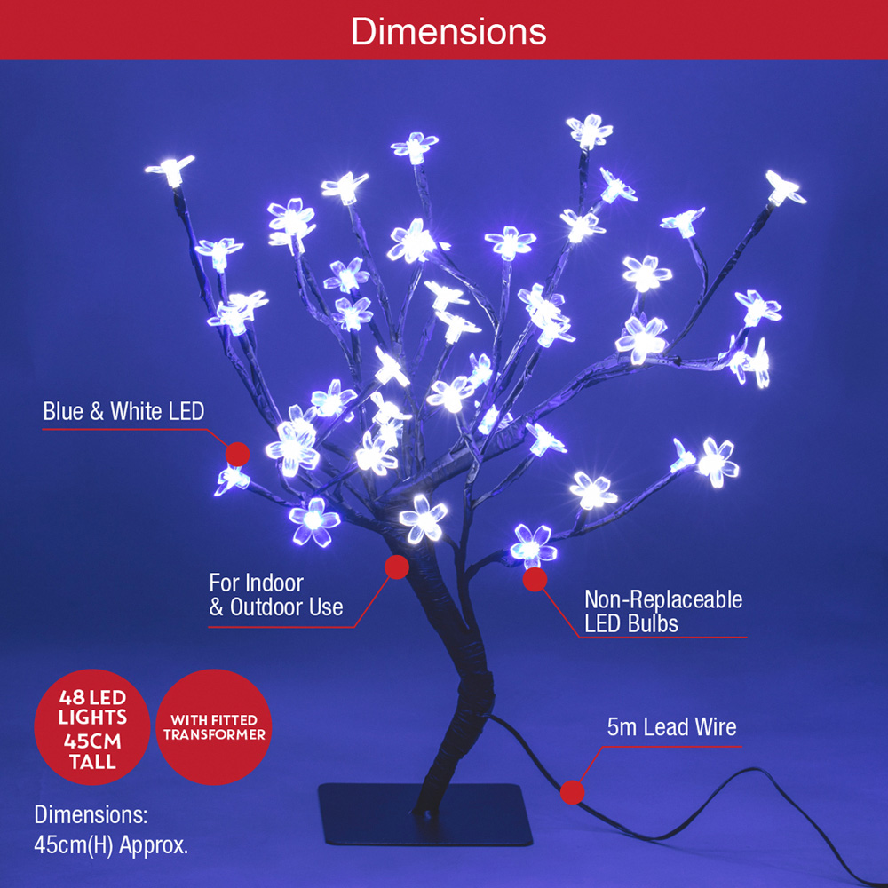 Add glimmer to your festive decor with The Christmas Workshop 48 Blue and White LED Blossom Tree. This blue and white LED blossom tree is a great indoor Christmas decoration to add festive lighting to your home. The tree is beautifully crafted and has 48 LED lights, illuminating the Christmas ornament. It stands at 45cm tall, making it the perfect size to be the focal point in any room. In addition to decorating your home, this LED cherry blossom tree can also brighten up office spaces, dorm rooms, and classrooms during the Christmas season. The tree is mains powered and has a five-metre lead wire from the power source to the stable square base of the ornament.