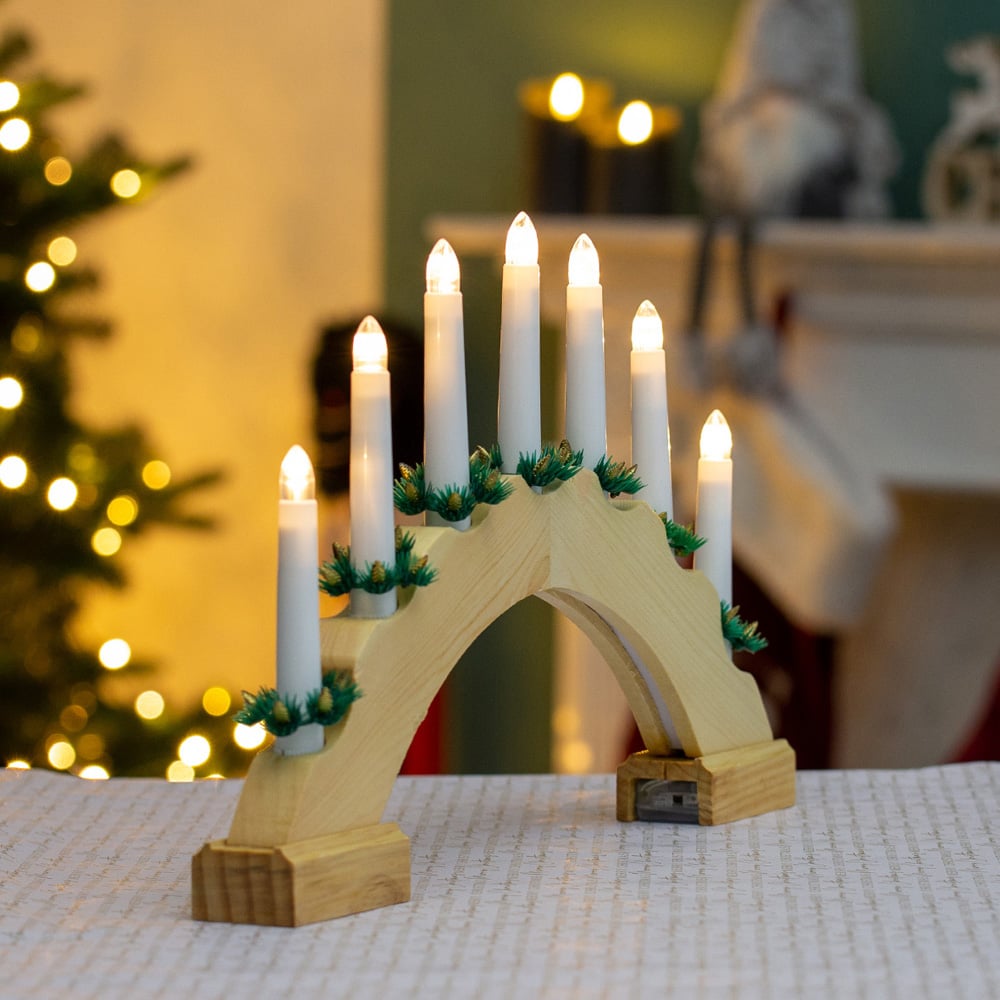 Upgrade your decor with The Christmas Workshop 7 LED Arched Wooden Candle Bridge Light. This wooden Christmas candle bridge is a classic festive ornament that will add a subtle yet distinctive glow to your decorations. The arched candle bridge has seven warm white LED lights, making it look like real candles. The candle bridge has mini pine cones, creating a timeless look that complements traditional Christmas decorations. This bridge is battery-powered and requires two AA batteries, which are not included in the product. The candle bridge measures 40cm x 27cm (W x H), making it ideal for placing on the fireplace, in the window, or on the dining room table during the Christmas season.