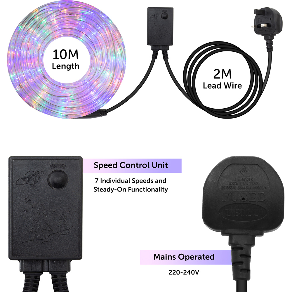Add a gorgeous touch to your decor with The Christmas Workshop Multi Colour LED Rope Light. This classic set of 10-metre multi-coloured LED Christmas lights is the perfect festive accessory to provide wonderfully bright and cheery illumination to your homes this Christmas time. This Christmas light is multi-functional as it can be used both inside and outside, doubling the opportunity to illuminate your homes this Christmas. The lights feature a built-in speed controller allowing you to set the perfect flickering speed to illuminate your home in the style you wish. The festive lights are mains operated, and measure 10 metres in length, with a 2-metre gap between the power plug and the first batch of lights. When the festive season is over and the decorations come down these lights come into their own as they can be used to provide decorative illumination to weddings, birthday parties and any other celebrations where there needs to be some added colour and vibrancy.