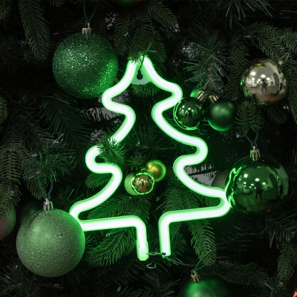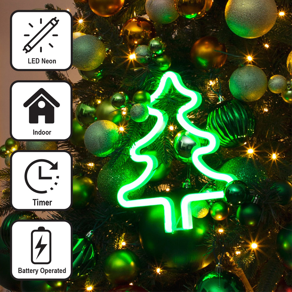 Brighten your home with the Christmas Workshop Neon Christmas Tree LED Hanging Light. It glows in green, matching the traditional Christmas tree colour and creating a warm atmosphere. This unique light can be hung on a hook, a wall, or even on the branches of a Christmas tree. The LED strips are safely enclosed inside the flexible neon tube, reducing the risk of breakage. It also includes a six-hour timer function, allowing you to turn on in the evening and switch off during the daytime to save energy. This battery-powered light requires three AA batteries (not included).