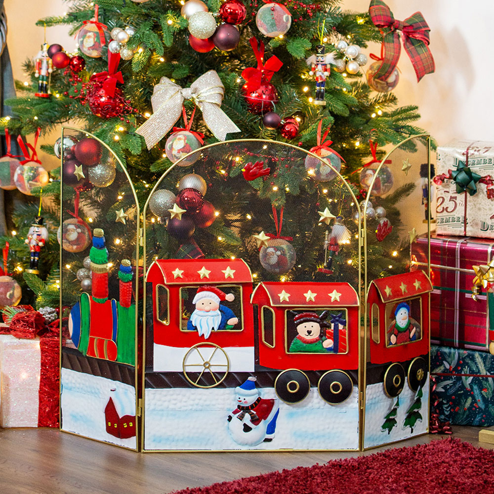 Enjoy the festive warmth with The Christmas Workshop Santa and Snowman Train Fire Guard. This decorative fire guard is the perfect festive accessory to add some extra sparkle to your home. It displays a specific festive scene that allows for a customised landscape for November and December. The fireguard is manufactured from metal and features a mesh finish. The screen measures 91 x 63cm and provides a fantastic focal point for your front room. The side panels are hinged, you can push them as far back as you like, enabling you to adjust the width of the fireguard to fit your fireplace. The beauty of this product is that it can also be used as protection for your Christmas tree. You can simply place this around the base of the tree and keep away any prying hands from your children or climbing from cats and dogs. Please note: This item is for decoration only and is not suitable to be used in front of a lit fire.
