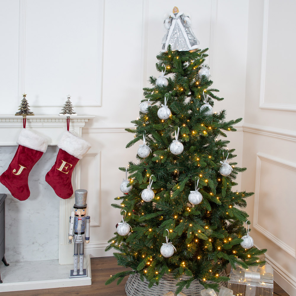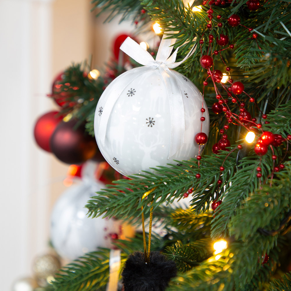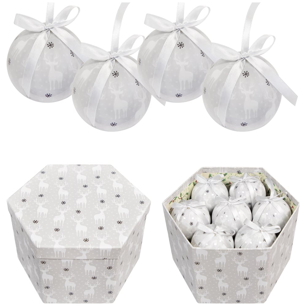 Add a touch of elegance to your Christmas tree with this charming The Christmas Workshop 14 Piece White and Silver Reindeer Bauble. Featuring a silver background with reindeer and snowflakes, these baubles are made from recycled polyfoam. It comes in a festive gift box that also serves as convenient storage. Their lightweight design ensures they won't weigh down your tree.