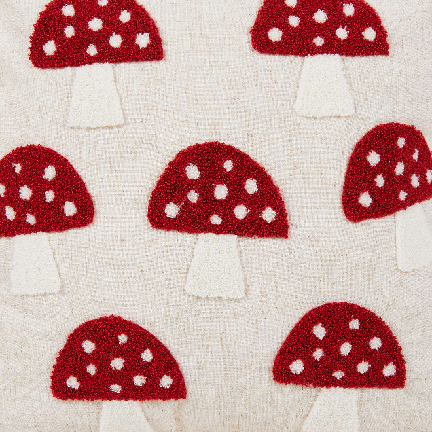 Enhance your home with this Toadstool Cushion. This charming cushion features an embroidered design of tufted red toadstools on a white background, accented with red trim piping for added texture. Ideal for a cosy aesthetic, it adds a touch of whimsical charm to any room. Comfortable and effortlessly fashionable, it not only elevates your decor but also provides comfortable seating.