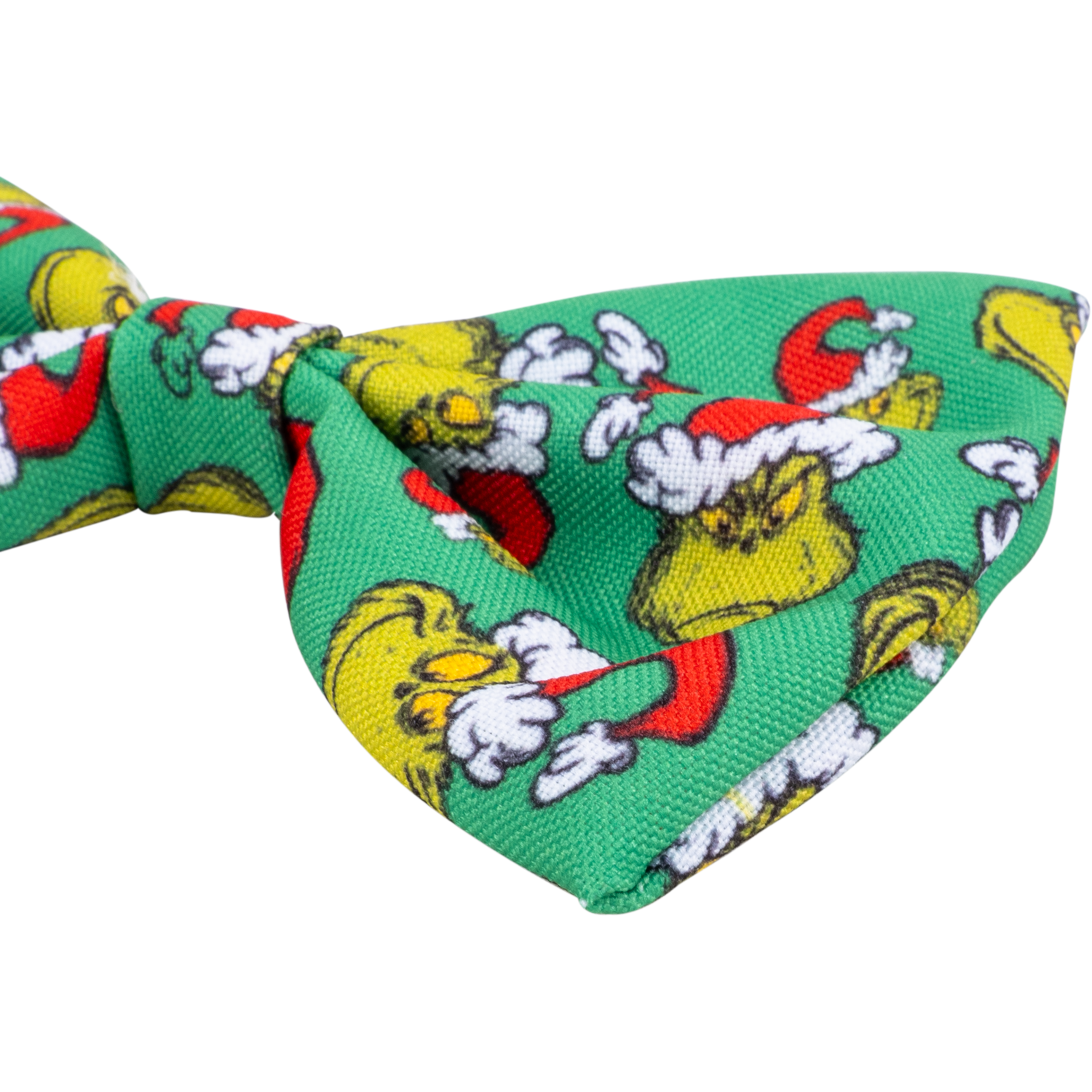 Bring a mischievous twist to your festive wardrobe with this bold The Grinch Photo Prop Bow Tie. Featuring the unmistakable smirk of the Grinch himself, it's the perfect accessory to steal the spotlight at any Christmas gathering. Perfect for use as a photo prop, this bow tie adds cheeky cheer and instant personality to any outfit.