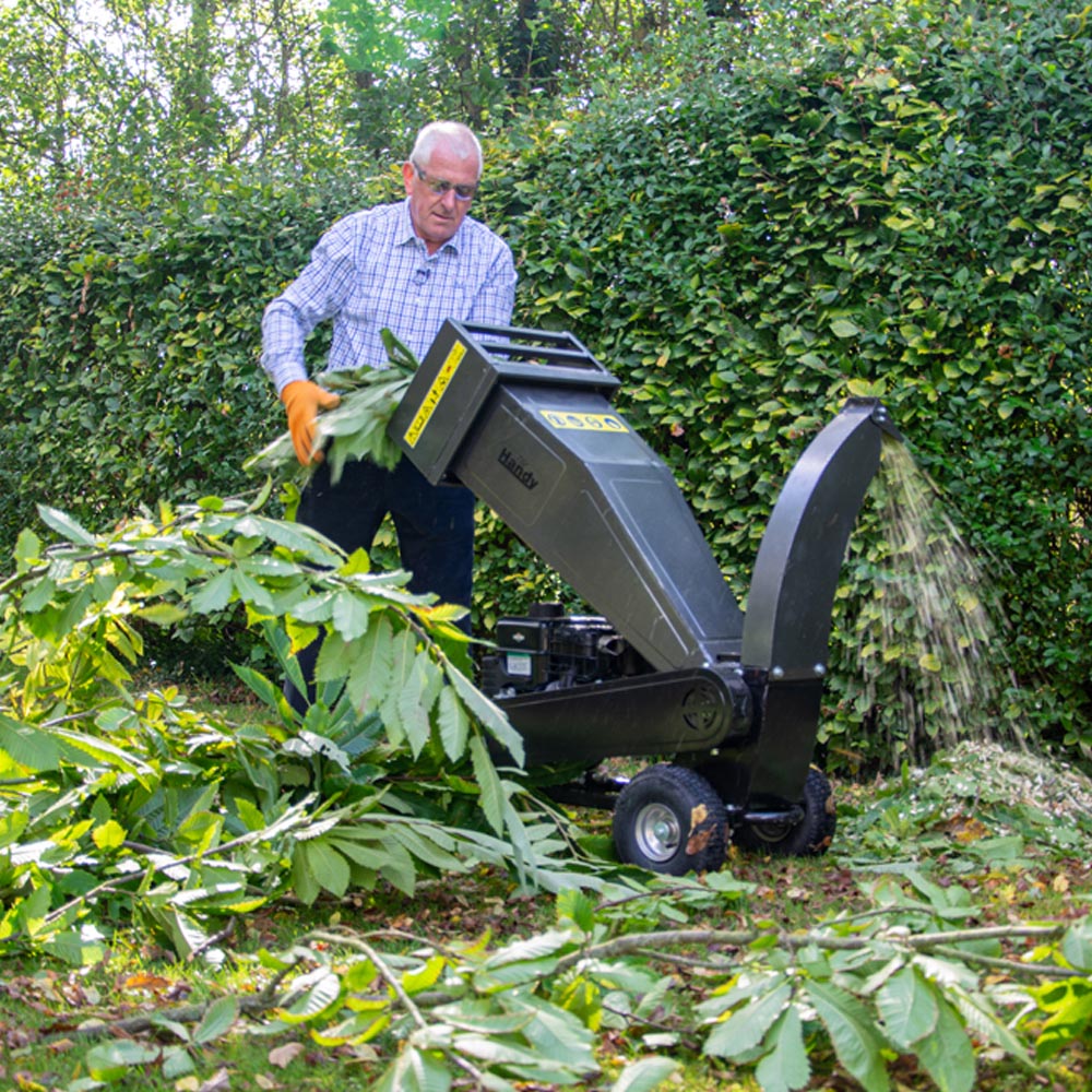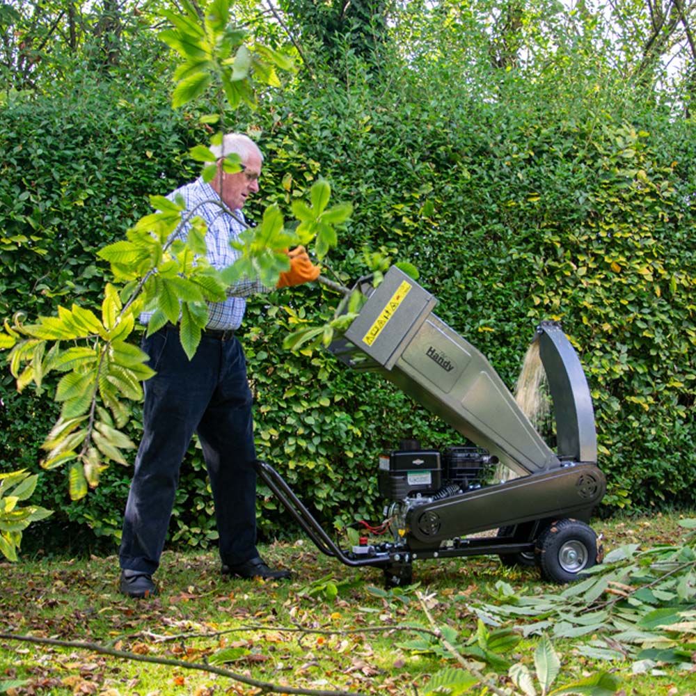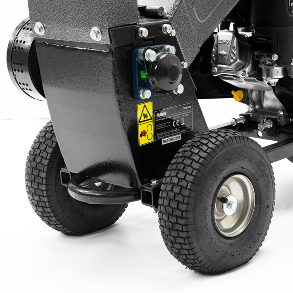 The Handy THPDS65 Petrol Drum Chipper Shredder, With its immensely powerful 208cc Briggs & Stratton engine driving two drum mounted blades via high-torque V-belt drives, the Handy THPDS65 Petrol Chipper-Shredder will handle large volumes of thick, woody debris with the utmost speed and efficiency. Key to that top-end performance is its Briggs & Stratton XRD950-Series engine, a powerful, premium-range 208cc horizontal-shaft unit that’s been designed with toughness, reliability and efficiency to the fore. An OHV configuration provides a substantial cut in fuel-costs, exhaust-emissions and noise, while a float-feed carburettor and Magnetron electronic ignition make the starting-process fast, dependable and stress-free. The aggressive drum-mounted blades on the Handy THPDS65 Petrol Chipper-Shredder are driven via twin parallel V-belt drives for optimum torque-transfer and superior durability – a snapped belt can be quickly replaced, while a bent crankshaft presents a far more serious problem. This fast-working machine incorporates a self-feed mechanism that maximises productivity by enabling you to ready the next load while the previous one is being drawn into the cutting-system. It sits on widely-spaced pneumatic tyres, so it will remain solidly stable during operation, and it benefits from an emergency-stop switch for peace-of-mind when it comes to user-safety. The transport-wheels on this model facilitate straightforward site-to-site movement and are mounted on ball-bearings so as to ensure a smooth run across rough ground.