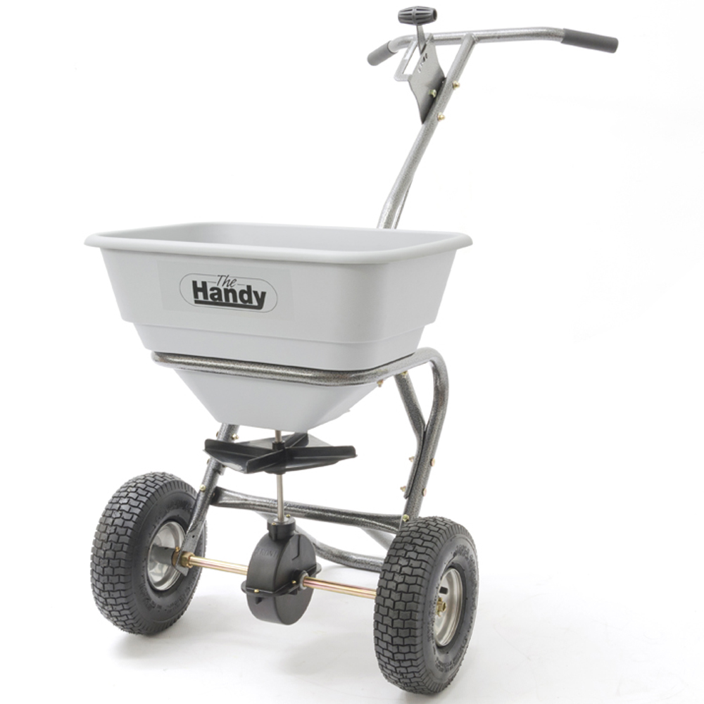 The Handy THS70SALTHDUTY 31.7kg (70lb) Heavy Duty Push Salt Spreader, The THS70SALTHDUTY is a heavy-duty 70lb salt push spreader, perfect for efficiently distributing refined ice melting salt, fertilizers, granules, grass seeds, and more. Its adjustable feed control allows precise spreading, while the 3.05m-3.66m (10’-12’) spread width covers large areas quickly. With pneumatic wheels and a stainless steel frame, it glides smoothly even on rough surfaces. The easy 4-point assembly, metal drive gears, and polypropylene hopper ensure durability and ease of use.