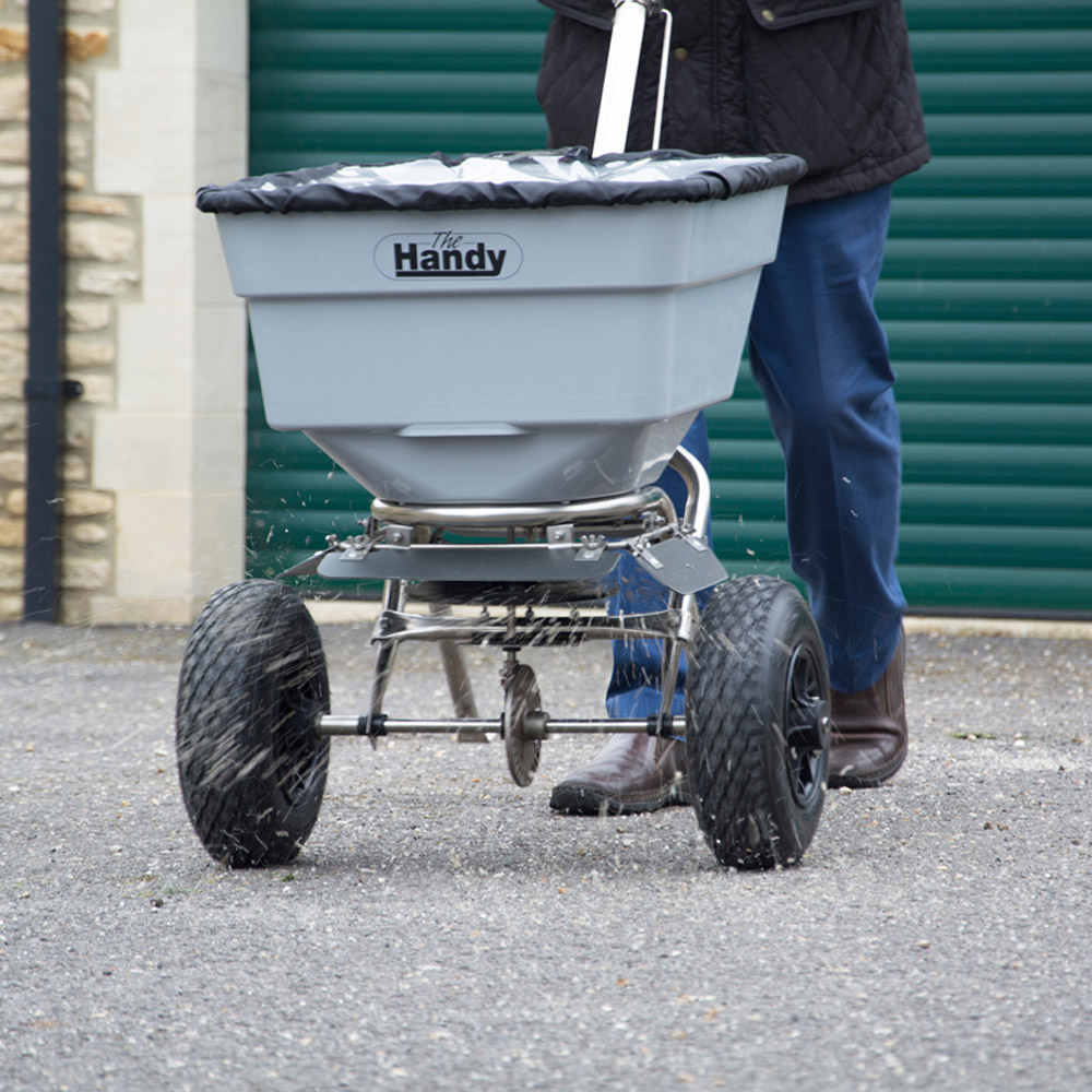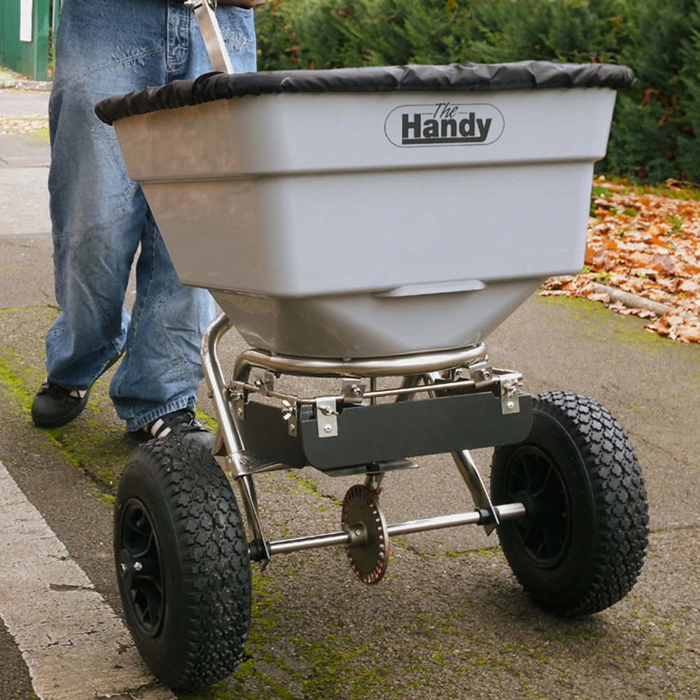 The Handy THSS100 45kg (100lb) Salt Spreader, Enjoy an even faster large-area area work-rate with this 45kg capacity salt spreader from The Handy. It delivers an expansive 3.66m maximum spread width and is designed with careful attention to build quality. The spreader blends heavy-duty stainless-steel gearing with a stainless-steel axle and frame, and corrosion- and impact-resistant polypropylene hopper.