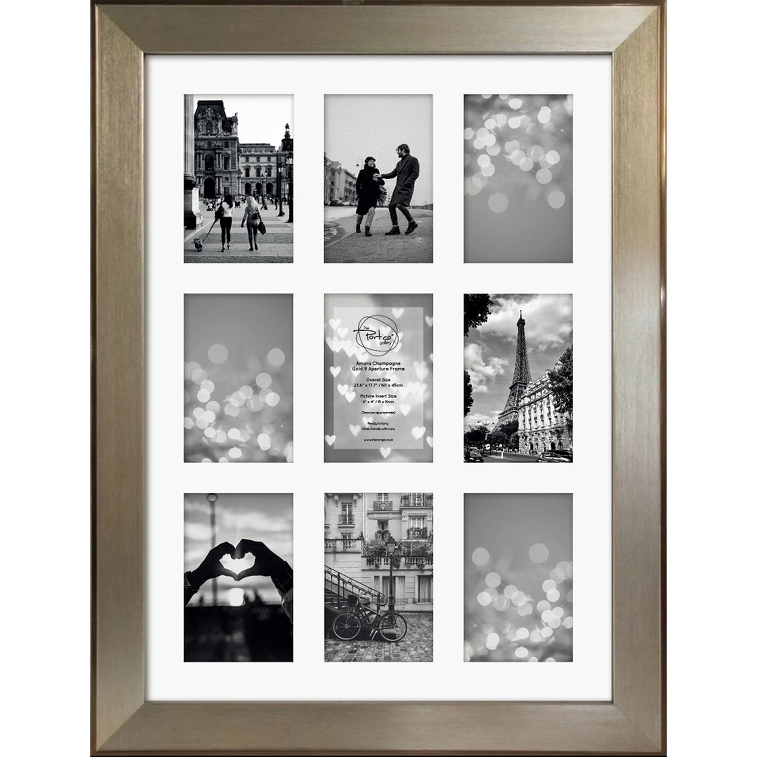 Display your favourite moments with grace and ease in this gorgeous Amara 9 Aperture Frame. The broad frame helps to highlight your photos, drawing the eye to your pictures whilst accenting them with an elegant golden hue. Ideal for hanging in your living room, hallway, or bedroom, this will help you make the most of every photo.