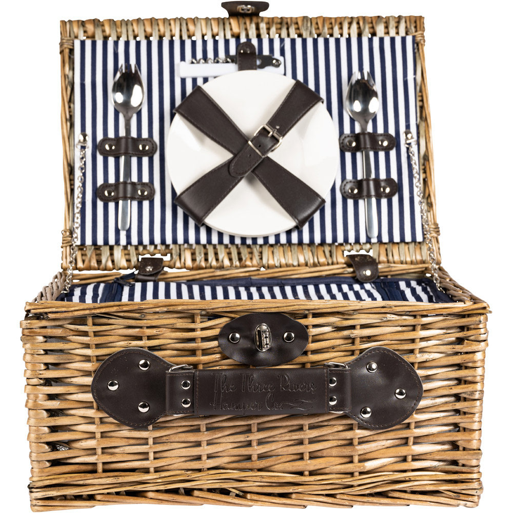 This luxurious wicker basket is the perfect centrepiece for an ideal picnic. It features a 20-litre insulated food compartment and includes two ceramic plates, two acrylic wine glasses, two stainless steel sporks, and a bottle opener—just add your favourite food and drinks. The high-density insulated compartment keeps contents chilled for up to four hours, and using ice packs will enhance its cooling performance. The basket has a white PEVA heat-sealed lining, which makes it easy to clean any spills. A sturdy PU handle on the side ensures easy carrying.