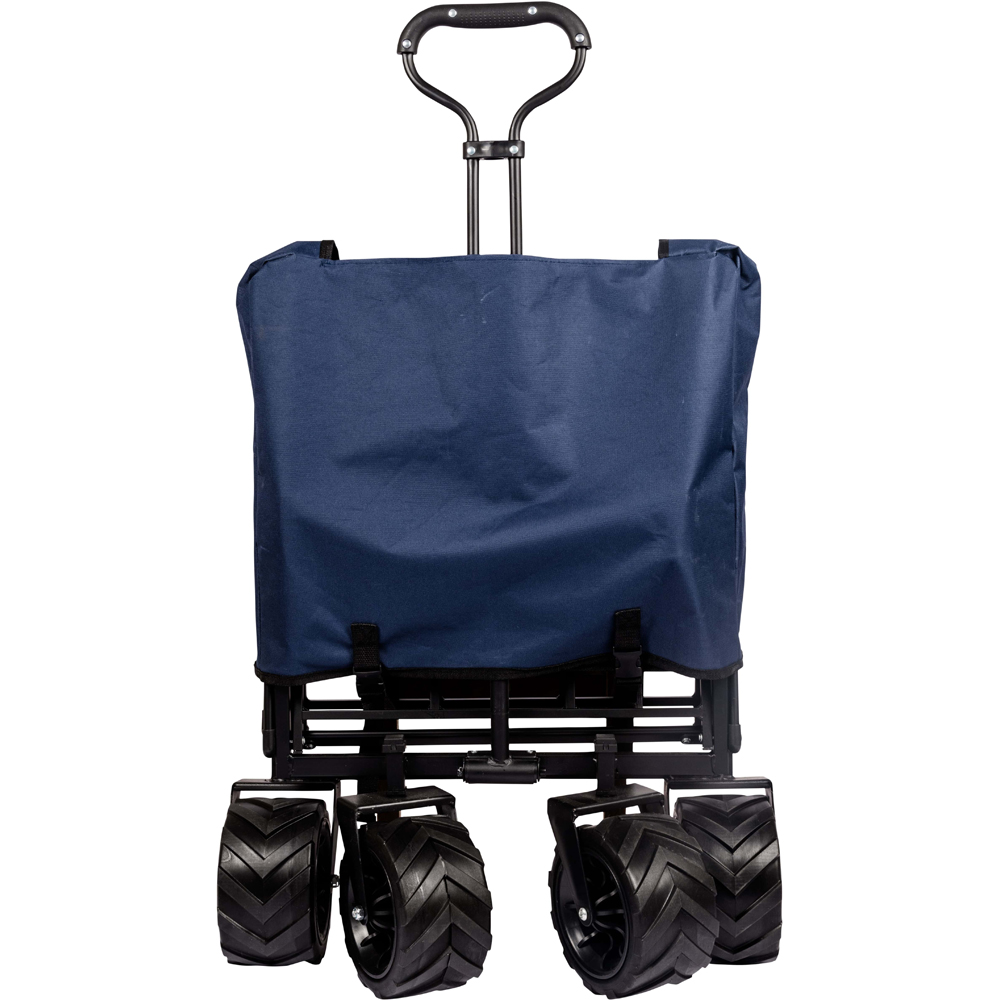This Three Rivers Wagon is perfect for camping, festivals, family picnics and days out. With a trip to the beach requiring more luggage than your average package holiday, make light of it with these must-have products, designed to carry up to 80kg of your essential stuff. Features a handy storage cover, retractable and telescopic handles and front wheel steering. With four oversized wheels, this XL wagon is the go-anywhere, highly manoeuvrable, all-terrain cart and will make light work of transporting all your gear, including the kitchen sink, without the need for stretched limbs and sore backs. They both open up and fold away in seconds, making them ideal for popping in your car and keeping on hand whatever the eventuality. This product is not a toy and should not be used by children or for carrying them in. Materials: Steel Frame with 600D Polyester lining.