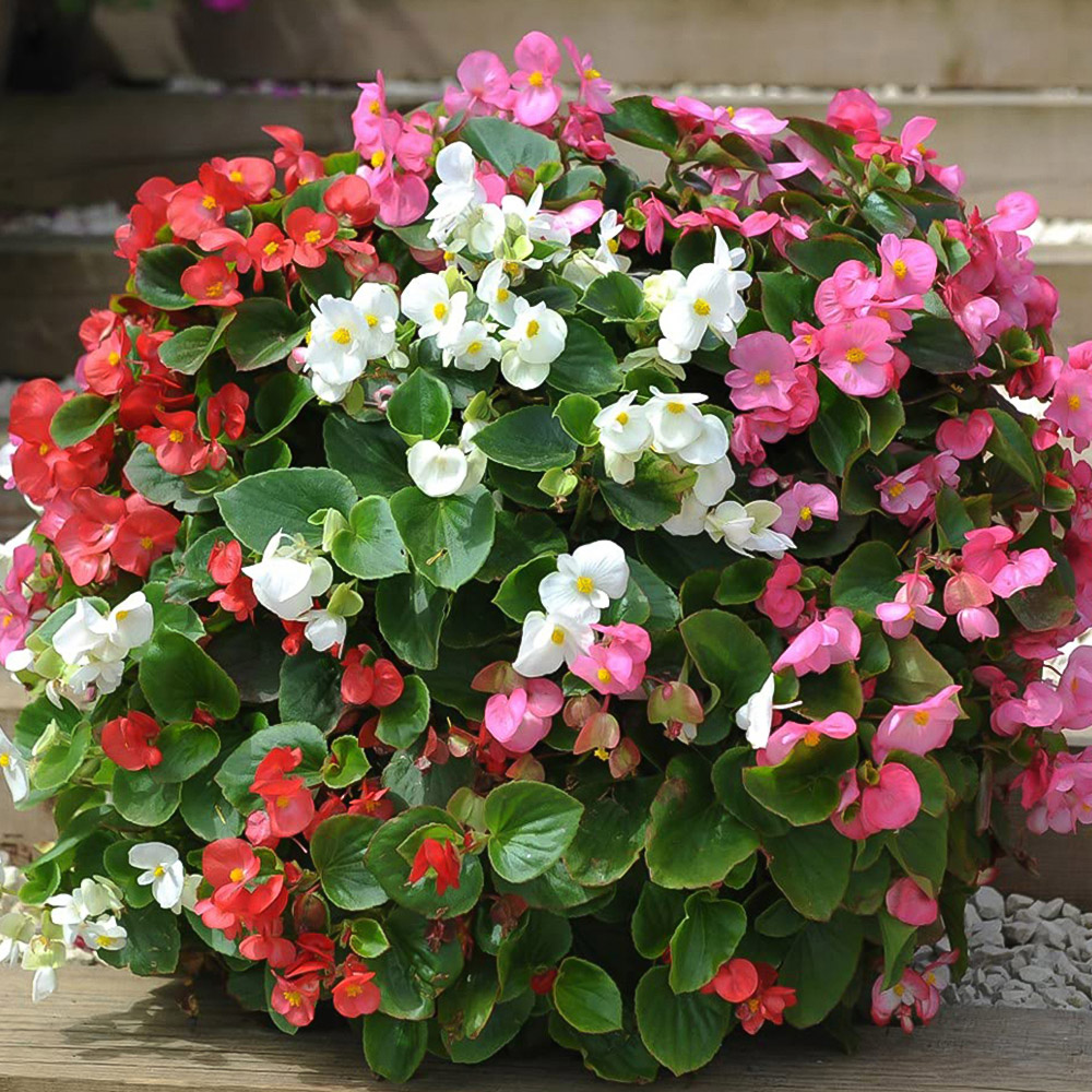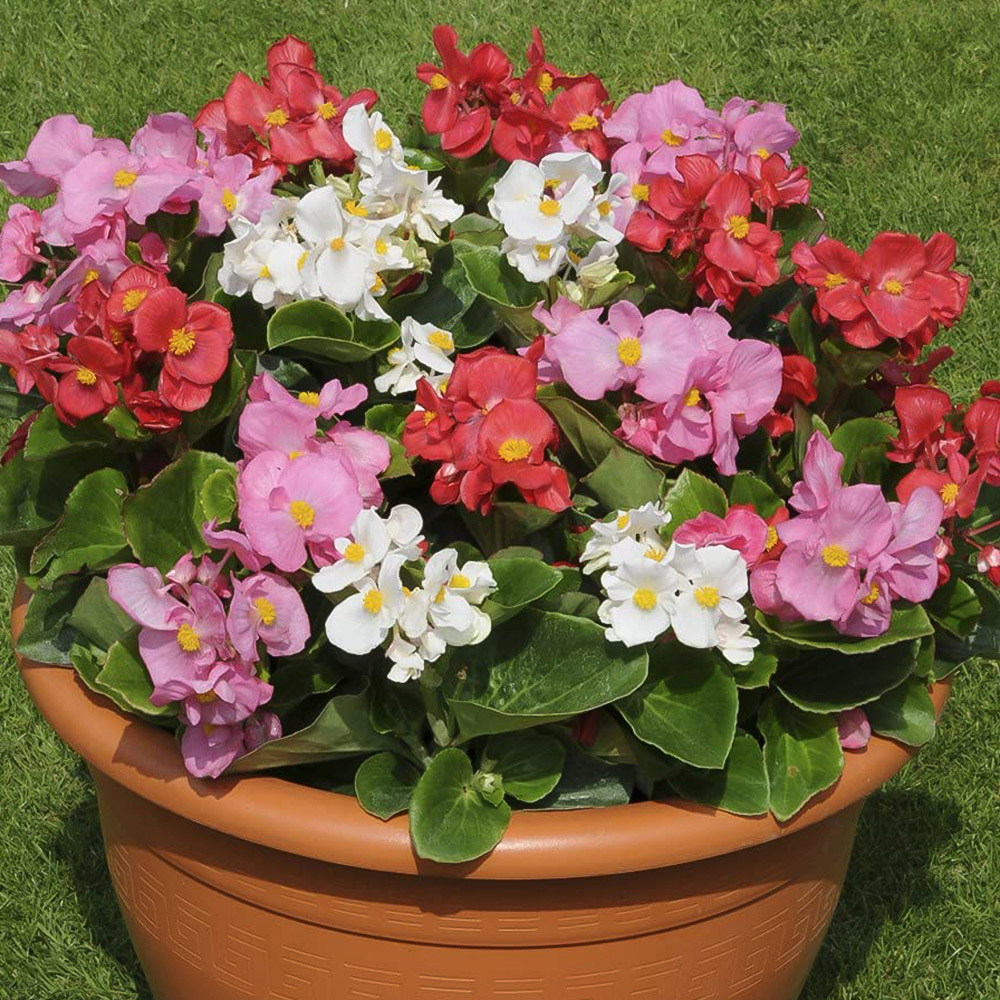 These exceptionally large begonia flowers, featuring stunning mixed colours and yellow centres, create a striking impact and provide long-lasting colour from July to October. You can plant begonia plugs directly into flower pouches, but it's best to pot them first and grow them in bright, frost-free conditions if you wish to display them in baskets, window boxes, pots, or flower beds. Once the plants have grown larger, they can be transplanted into their final containers. After the last frost, acclimatise the begonia plants to outdoor conditions for seven to ten days before placing them in their final locations. Choose a sunny or semi-shaded spot that is sheltered from strong winds. It’s important to feed and water the begonia plants regularly throughout the growing season, but be careful not to over-water, as excessive moisture can cause the new flower buds to drop. Remember to deadhead any faded begonia flowers regularly to extend the flowering period and promote the production of more blooms. Please note that the images shown are for guidance regarding the expected results of mature plants. Different growing conditions may affect the results, and images may vary due to seasonal changes (e.g., deciduous plants will lose their leaves in colder months).