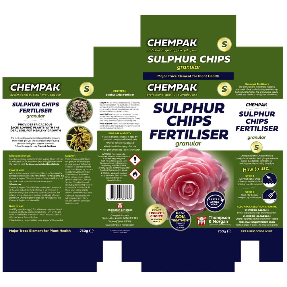 Important trace element gives ericaceous plants the ideal soil base for healthy growth Many ericaceous plants will not grow, or will show signs of trace element deficiencies if the soil is not ideal for that plant. Most common ericaceous (lime-hating) plants will not grow in limey soils. Chempak Sulphur chips will gradually reduce the pH content to make the soil suitable for healthy growth. Rate of use: Use 4oz. per sq. yd. (135gms per sq. m. ). This will reduce the pH value by approximately 0. 5 to 1 unit on the pH scale. It is advisable to wait until the soil warms to see the effectiveness of this application. If the desired pH is not realised more sulphur will be needed. Soil pH: This is a measure of soil acidity or alkalinity on a scale from 0-14 units. Neutral soil condition has a pH value of 7; acid soils are lower than this; alkaline (limey) soils have a higher reading. pH6 = acidic, pH7 = neutral, pH8 = limey. Soil testing: Soil pH is easily tested by either chemical or electronic DIY test kits available in most garden shops. Ideal soil: Once ideal soil pH is achieved it should be monitored regularly to see it is not creeping back, as lime frequently 'comes through' on chalky soils. Apply remedial sulphur chips if necessary. Plant foods: Sulphur is also an important major plant food. Chempak Sulphur chips will provide this essential element. Iron deficiency: Many plants will exhibit chlorosis (yellowing) on limey soils. Correcting the soil condition will provide a permanent solution. Chempak Iron will correct these deficiencies quickly and may be an alternative or temporary solution. Safety: Sulphur is combustible and may give off toxic fumes in the event of a fire. Fire fighting measures - douse with water. Store safely in the original container away from heat sources. Wash hands after use.