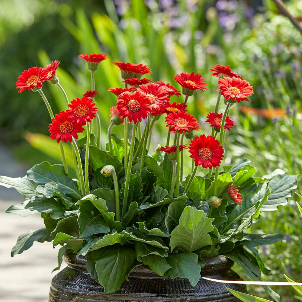 The idea of growing gerberas outside 10 years ago was practically unbelievable, but with the introduction of the Gerbera Cheeky collection proudly presented by Thompson and Morgan, this dream is now an affordable reality! The vibrancy available in these classical, daisy-like blooms always makes fine additions to a patio or flower garden, and their small blooms really solidify their beauty. Pot up gerbera plants and grow them on in frost-free conditions until large enough to plant outdoors. When they are well grown and all risk of frost has passed, acclimatise them to outdoor conditions over seven to 10 days before transplanting into their final positions. Plant gerberas outdoors in fertile, well-drained soil in sheltered, sunny borders. When growing gerbera in patio containers, use a loam-based compost such as John Innes No.2. Pot up gerbera plants and grow them on in frost-free conditions until large enough to plant outdoors. When they are well grown and all risk of frost has passed, acclimatise them to outdoor conditions over seven to 10 days before transplanting into their final positions. Plant gerberas outdoors in fertile, well-drained soil in sheltered, sunny borders. When growing gerbera in patio containers, use a loam-based compost such as John Innes No.2. Please note: This product cannot be delivered outside the United Kingdom. Specifications: Position in: Full Sun Height Up to 30cm (12 inches) Spread Up to 30cm (12 inches). Supplied as a Gerbera Garvinea Cheeky Red 7cm Potted Plant. Flowering period: June to October. Images shown are for guidance only of the expected results from plants upon maturity. Different growing conditions might vary the results. Image may be included for illustration of supply, but can vary due to seasonality changes (e.g. deciduous plants lose leaves in colder months).