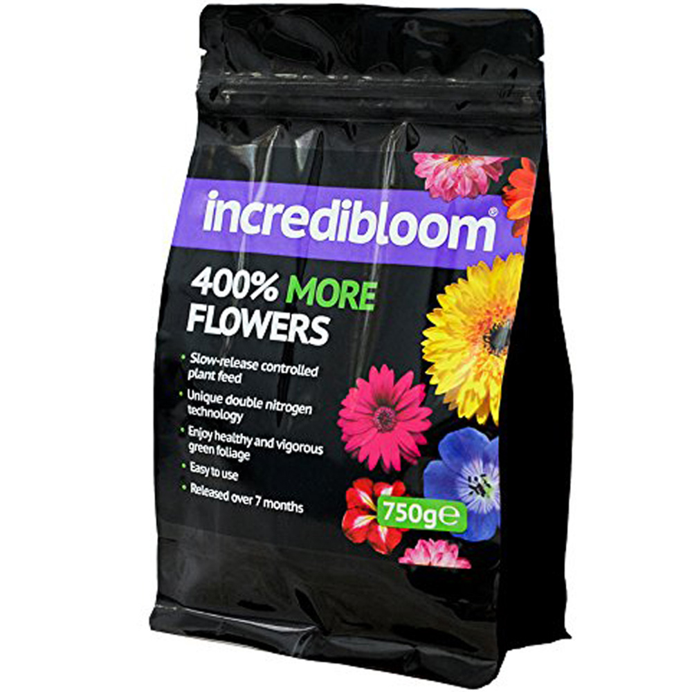 Incredibloom® Plant Food is an easy-to-use, single application Fertiliser that guarantees that your plants will be fed all the correct nutrients as and when they need them during the growing season. Enjoy healthy and vigorous green foliage and a huge amount of blooms. The trials proved that up to 400% more blooms were produced on stronger plants when Incredibloom® fertiliser was used; its controlled slow release of the Fertiliser means that the nutrients are only released into the Compost when conditions are right for the plants, saving you money as there is no wastage. Enjoy bigger flowers and healthier foliage, all in one cheap and easy-to-use package. Try Incredibloom® Plant Food for yourself and we guarantee you’ll notice the difference! Mix the Incredibloom® fertiliser into your Compost at the rate per litre of Compost that is recommended, suitable for use with Hanging Basket Plants, Patio Plants and as a general Garden Fertiliser. Contents: 1 x 750g pouch of Incredibloom® fertiliser N:P:K 14519 + 2MgO+22S03 with micro nutrients.