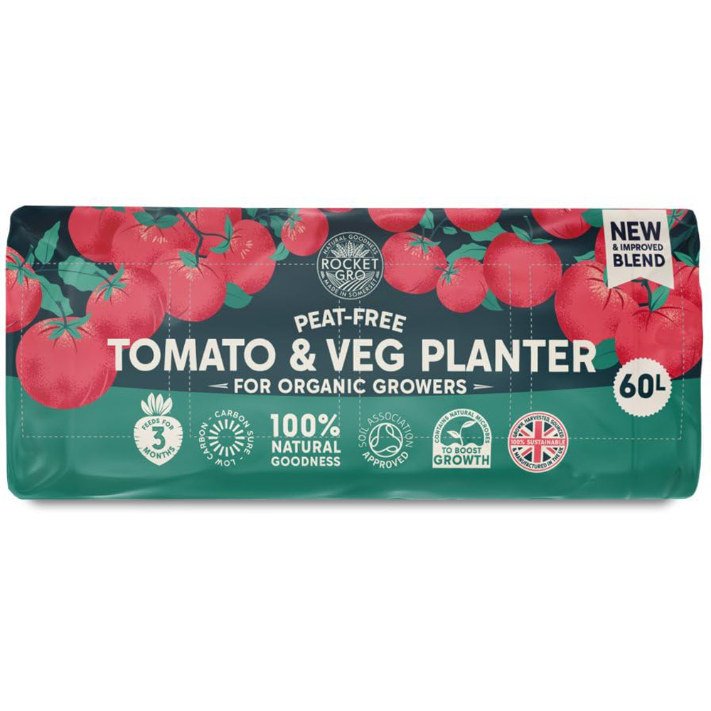 Nurture your passion for gardening with this Thompson and Morgan RocketGro Tomato and Veg Planter. It provides an organic, chemical-free, and peat-free solution for growing delicious tomatoes, vibrant salad leaves, and hearty vegetables. With its generous 60-litre size, this grow bag offers ample space for your plants to thrive. Packed with a perfect balance of nutrients, it slow-feeds your plants for three months, promoting healthy growth and bountiful harvests. Whether you're an indoor gardener or prefer outdoor cultivation, this planter is versatile and easy to use. Produced by RocketGro at their farm in Somerset, this grow bag is 100% organic and Soil Association-approved. It contains a blend of certified green compost and RocketGro soil improver, ensuring your plants receive the best care. The addition of bio-active microbes further enhances plant health and vitality. Sized at 1030 x 320 x 100mm, this extra-large grow bag is perfect for those serious about their vegetable and tomato growing. Grow with confidence, knowing that your plants are supported by a nutrient-rich, sustainable solution. Supplied as 2 x 60 litres. Images shown are for guidance only and show the expected results of plants upon maturity. Different growing conditions might vary results. Image may be included for illustration of supply but can vary due to seasonality changes (e.g. deciduous plants lose leaves in colder months). Decorative pots are not supplied.