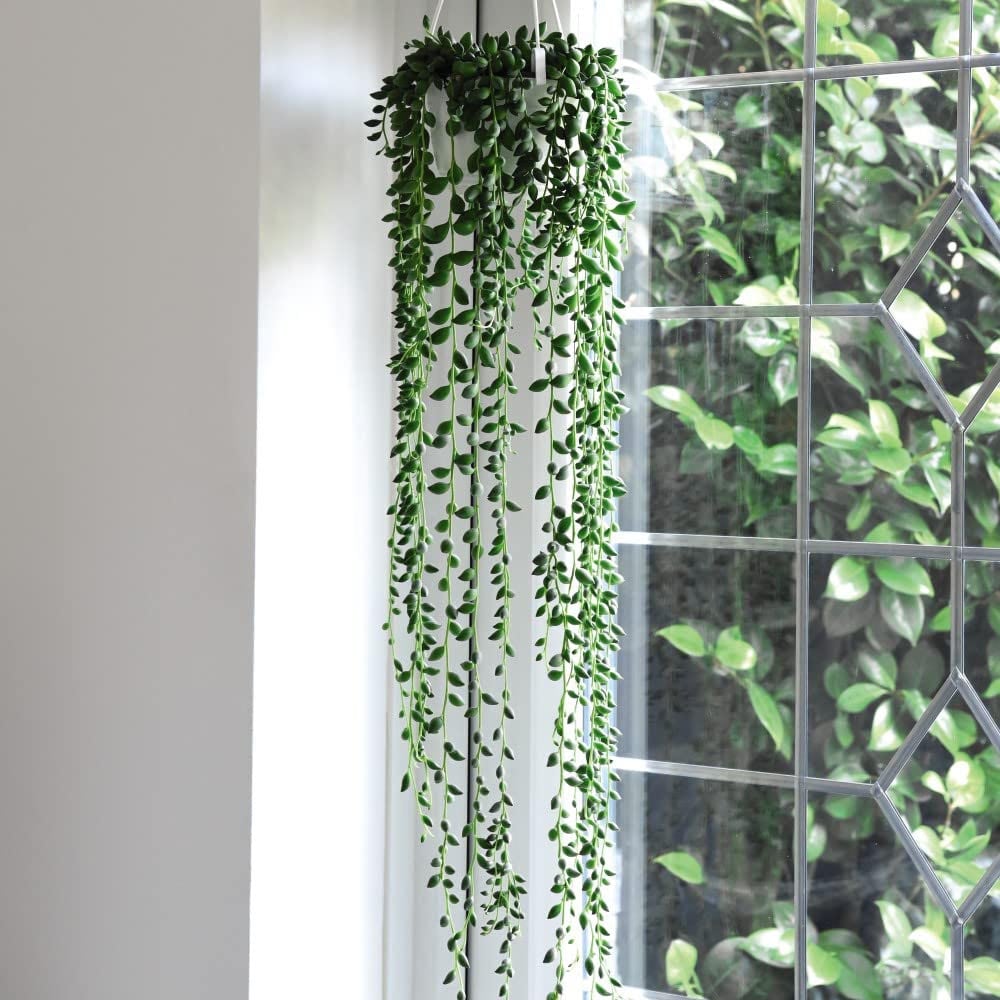 This fascinating house plant spills from its pot in long strings of tear-shaped, bead-like foliage. Senecio 'String of Teardrops' is an intriguing succulent with an eye-catching, trailing habit, which makes it perfect for indoor hanging baskets or cascading from a shelf. As a succulent, it is naturally drought tolerant and easy to grow, and will create a marvellous focal point in a brightly lit room. Trails to 50cm (20") and spreads 20cm (8"). Position in a warm room away from cold draughts and radiators, with a constant temperature above 16C (60F). Choose a bright position in full sun. Plant height and spread are seasonal. The height and spread of the plant delivered will vary depending on the season, meaning arrival images are an indication only.