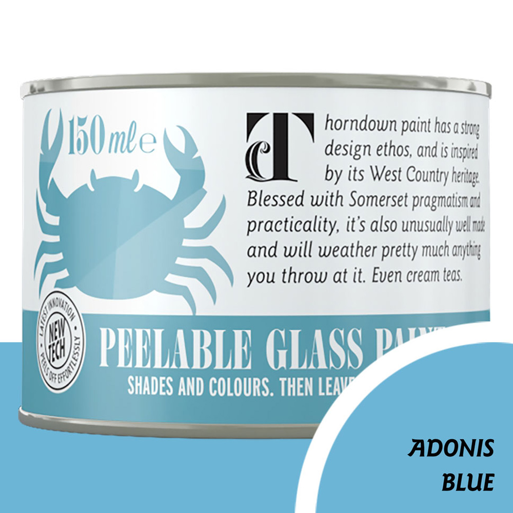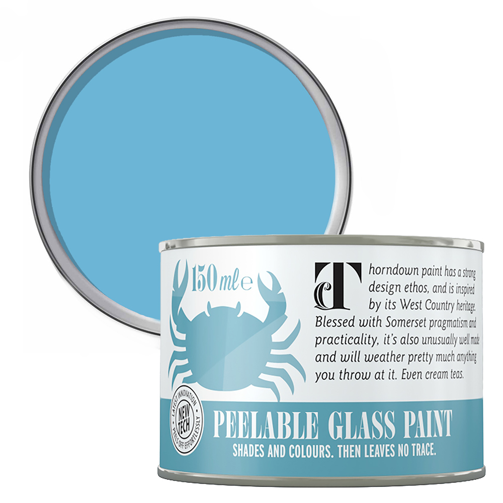 Get creative with Thorndown Adonis Blue Peelable Glass Paint. This water-based peelable glass paint is made from resin using 100% recycled plastics. The old coatings can be used for recycling. When painted on any shiny surface - it is perfect for shading or privacy that you can peel off to remove! This opaque, bright blue glass paint is perfect for temporary decorations at Christmas, Halloween and parties or as a permanent paint for craft projects like tiles, mirrors, shower screens and more. Easy to shade or colour any glass or shiny surface – this paint allows you to be as creative as you like. It is non-toxic, virtually VOC-free (Volatile Organic Compounds 0.05%) and halogen free with a low carbon footprint. This ready-to-use paint covers 12 square meters per litre and can be used inside or outside providing a durable, water-repellent coating. Along with glass - the paint can also be applied to polycarbonate and acrylic glazing. Whether you brush, roller, spray or mix colours, it is simple and fun with results you can be proud of. Quantity: 150ml.