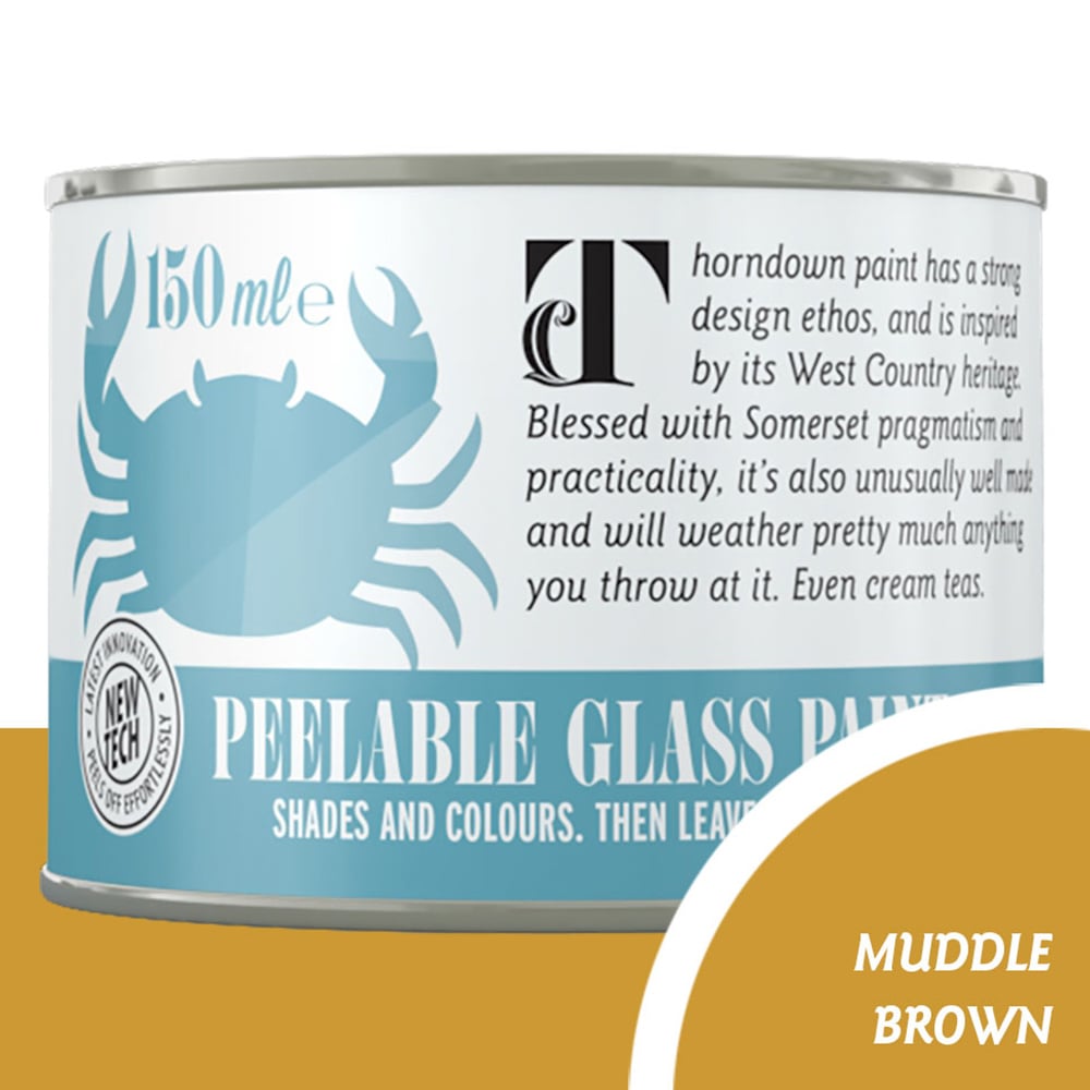 Add a touch of warmth to any surface with Thorndown's Muddle Brown Peelable Glass Paint, a mesmerising translucent amber-brown glass paint. Crafted with innovation and sustainability in mind, this revolutionary water-based peelable glass paint is made from a resin that utilises 100% recycled plastics. Unlock your creative potential with its exquisite range of opaque and translucent colours, perfect for practical shading or creating your own stunning stained glass designs. It's ideal for shading, providing privacy, or adding a unique touch to your projects. When you're ready for a change, simply peel it off effortlessly. Whether you're looking to enhance your space during festive seasons like Christmas, Halloween, and parties or seeking a permanent solution for craft projects like tiles, mirrors, or shower screens, this paint offers exceptional versatility. Shade or colour any glass or shiny surface with ease using this paint. Be as creative as you like and bring your visions to life. This paint is non-toxic and virtually VOC-free (volatile organic compounds at only 0.05%), ensuring a safe and enjoyable experience. It's halogen-free and leaves a minimal carbon footprint, aligning with your commitment to the environment. Each litre of this ready-to-use paint covers an impressive 12 square metres, providing a durable and water-repellent coating. While a single coat is sufficient, applying a second coat will increase the opacity of the finish, allowing you to achieve your desired effect. Feel confident using this paint both indoors and outdoors, knowing it will provide a long-lasting and reliable solution. Unleash your creativity beyond glass surfaces, as this peelable glass paint can be applied to polycarbonate and acrylic glazing as well. Whether you prefer brushing, rolling, spraying, or mixing colours, this product is designed to be simple and fun, ensuring you achieve results you can be proud of. Quantity: 150ml.