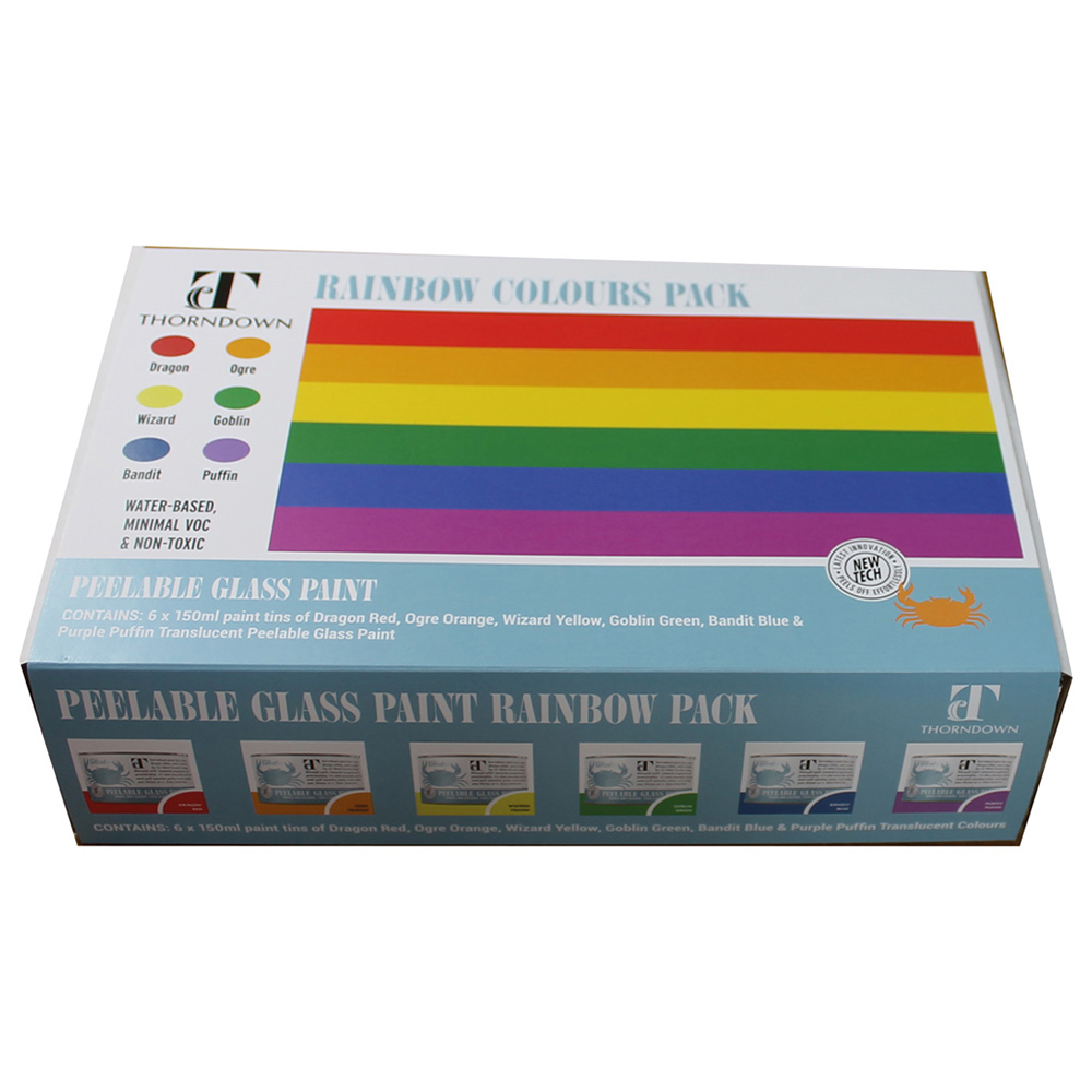 Unlock the magic of colours with this pack of Thorndown Rainbow Peelable Glass Paint. Put your artistic flair to use by creating your brilliant rainbow on any glass surface. This revolutionary water-based paint is made from a resin that uses only recycled plastics, making it a sustainable option. Its non-toxicity, near-absence of VOCs, and lack of halogens make a painting with it safe and environmentally friendly. Simply peel off the paint to start over whether you're shading, customising the interiors, or adding a bit of seasonal fun. The options are unlimited with simple application techniques like painting, rolling, or spraying. Because simplicity and enjoyment go hand in hand with creativity, let your imagination run wild with this glass paint. Set to paint the world with vivid, peelable rainbows. Quantity: 150ml each. Pack of 6.