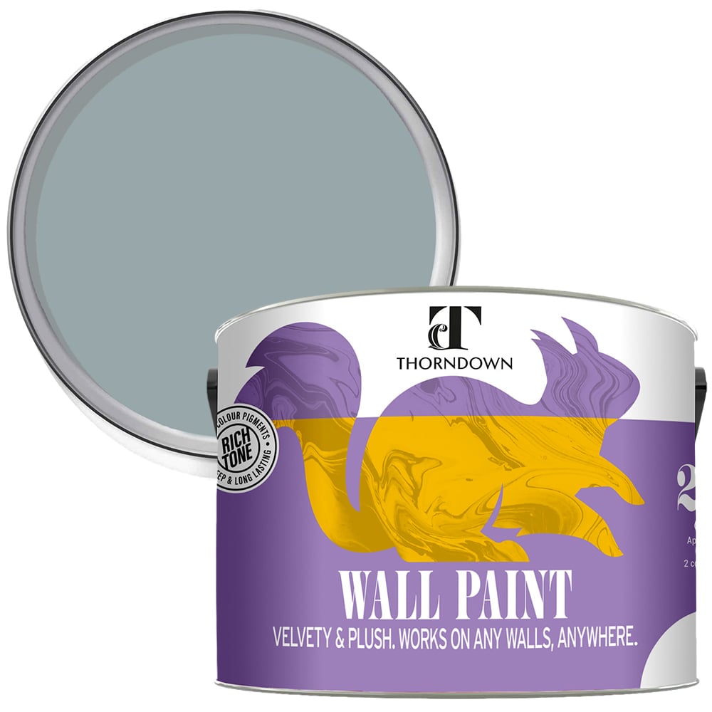Transform your walls with the Thorndown Walls and Ceilings Axe Blue Matt Paint 2.5L, a high-performance eco paint with minimal VOC and low odour, making it suitable for indoor use. It features a beautiful deep colour with a rich flat matt finish, offering less than 3% gloss. The paint is crafted with strong exterior-grade VOC-free colour pigment, sitting in a water-based, durable and dirt-resistant coating that can withstand cleaning. It is designed using sustainable, recycled, and recyclable raw materials wherever possible. This versatile paint can be used on all walls, ceilings, metal radiators, interior woodwork, and furniture. Thanks to its architectural exterior-grade colour pigments, this paint colour stays strong and true for several years.