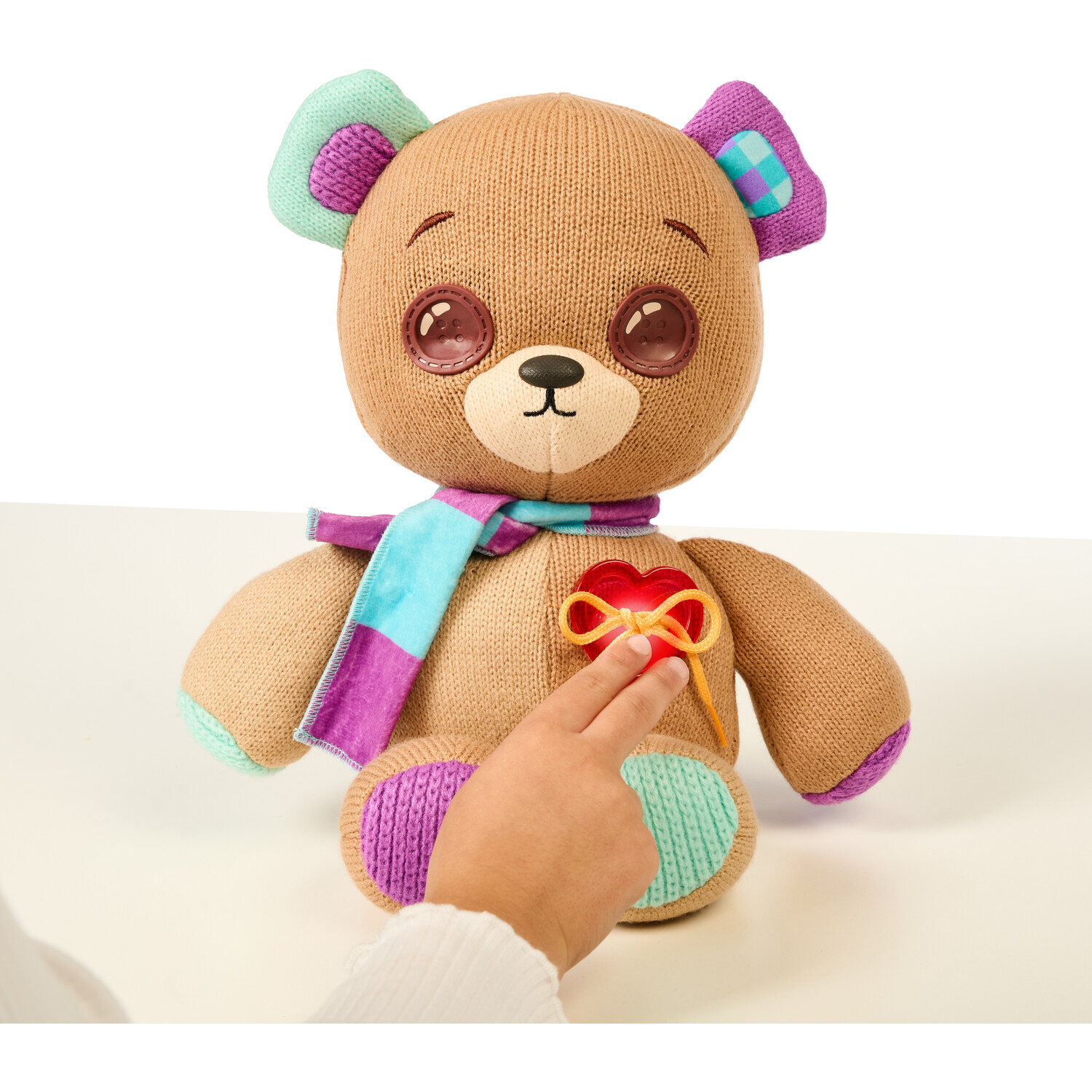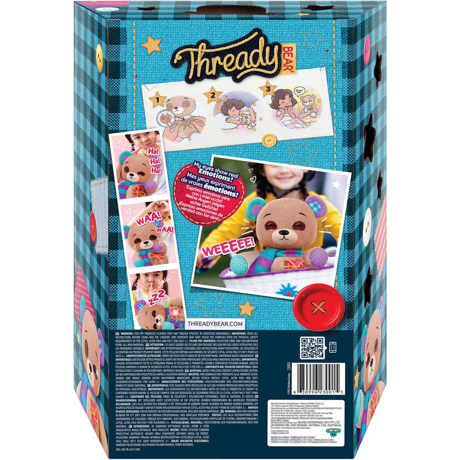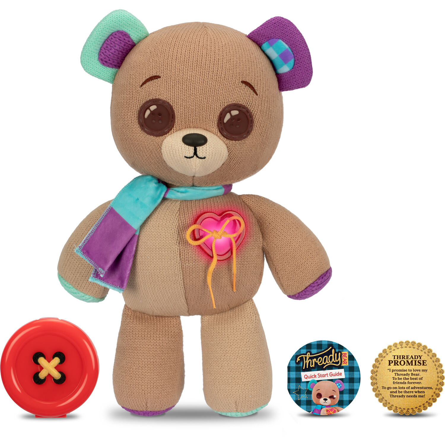 Give your child an unforgettable adventure with the Thready Bear. Inside his button container, you'll find a button heart and promise card. Attach the heart to his chest and press to bring him to life. He is full of surprises with a variety of interactive expressions and reactions. Play and explore together as his emotive eyes bring your child's adventures to life. Swing him around or take him on rides to hear his joyful sounds.