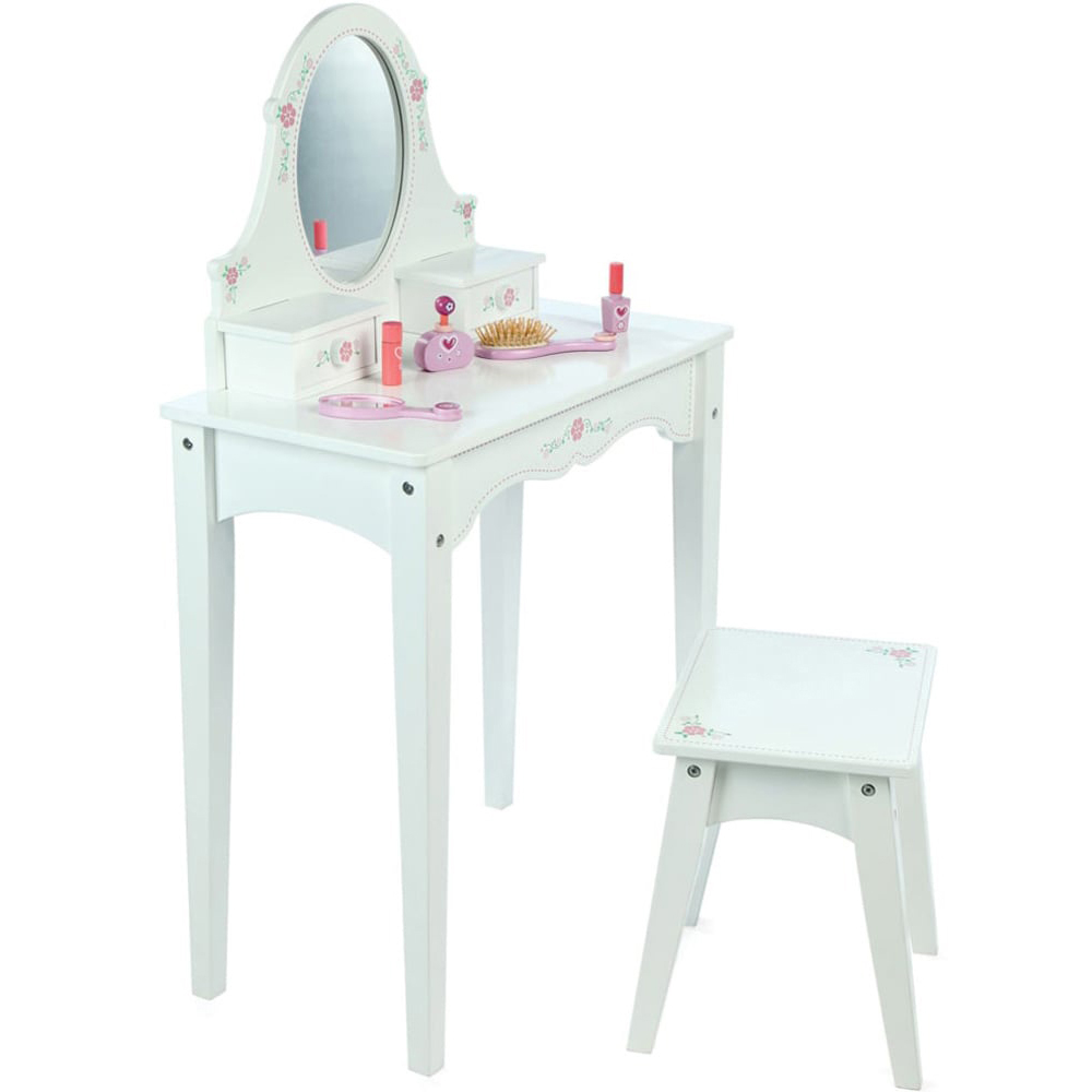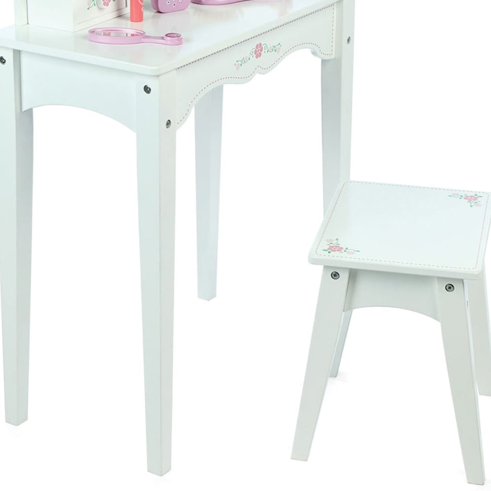 Give your child their own vanity space with this stylish Tidlo Kids White Dressing Table. This dressing table is the perfect addition to any bedroom or playroom. With its delightful floral decoration and built-in oval mirror, it is sure to inspire hours of creative pretend play. Whether little ones are giving themselves or friends a makeover, getting ready for the day ahead or styling their hair, it will all be fun with this sturdy dressing table for kids. The table comes complete with a stool and two storage drawers ideal for storing accessories. Durable, the dressing table is made with a high-quality wooden construction this dressing table has been built to last.