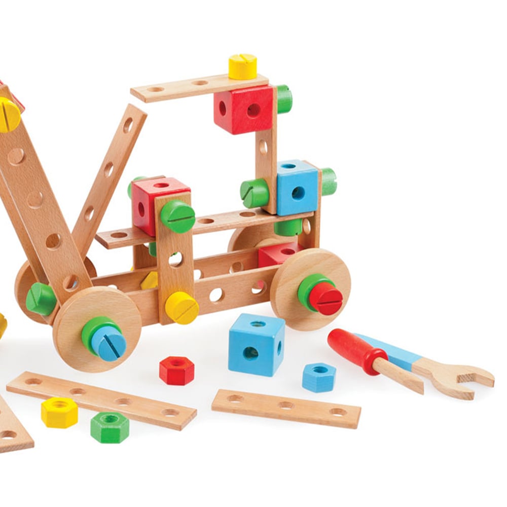 Encourage creative and imaginative play sessions with Tidlo Kids Wooden Construction Set. The 91-piece kit contains tools, coloured screws, bolts, wheels, blocks and planks; all of which can be pieced together to build even the most complex creations. Build it, bolt it and tighten it - use the screwdriver and spanner provided. This construction toy for kids is easy to assemble and take apart. There is even a booklet included with example models to get you started. This extensive construction toy set comes supplied in a handy storage bucket.