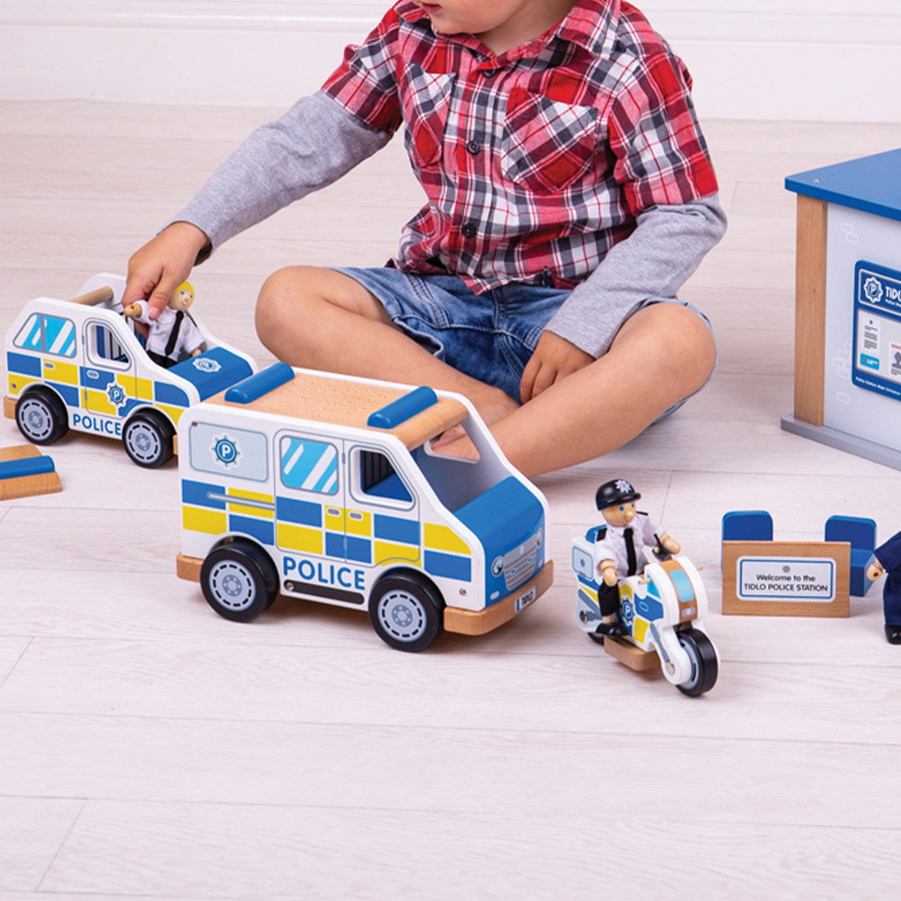 Develop hand and eye coordination with Tidlo Kids Wooden Police Car. Made with sturdy wooden construction, the police car is fully equipped and ready for any emergency. It is sure to have robbers everywhere shaking in their boots at the thought of being chased by this intricately designed vehicle! With a removable roof panel - once the baddies have been caught it will be easy to put them into the back of the car, before heading back to the station to lock them up in jail! Compatible with Tidlo police officers and prisoner figures (sold separately). Pair it with the Tidlo Police Station and watch as imaginations soar. Made from high-quality, responsibly sourced materials - it conforms to current European safety standards. Dimensions: W21cm x H13cm x L11cm.