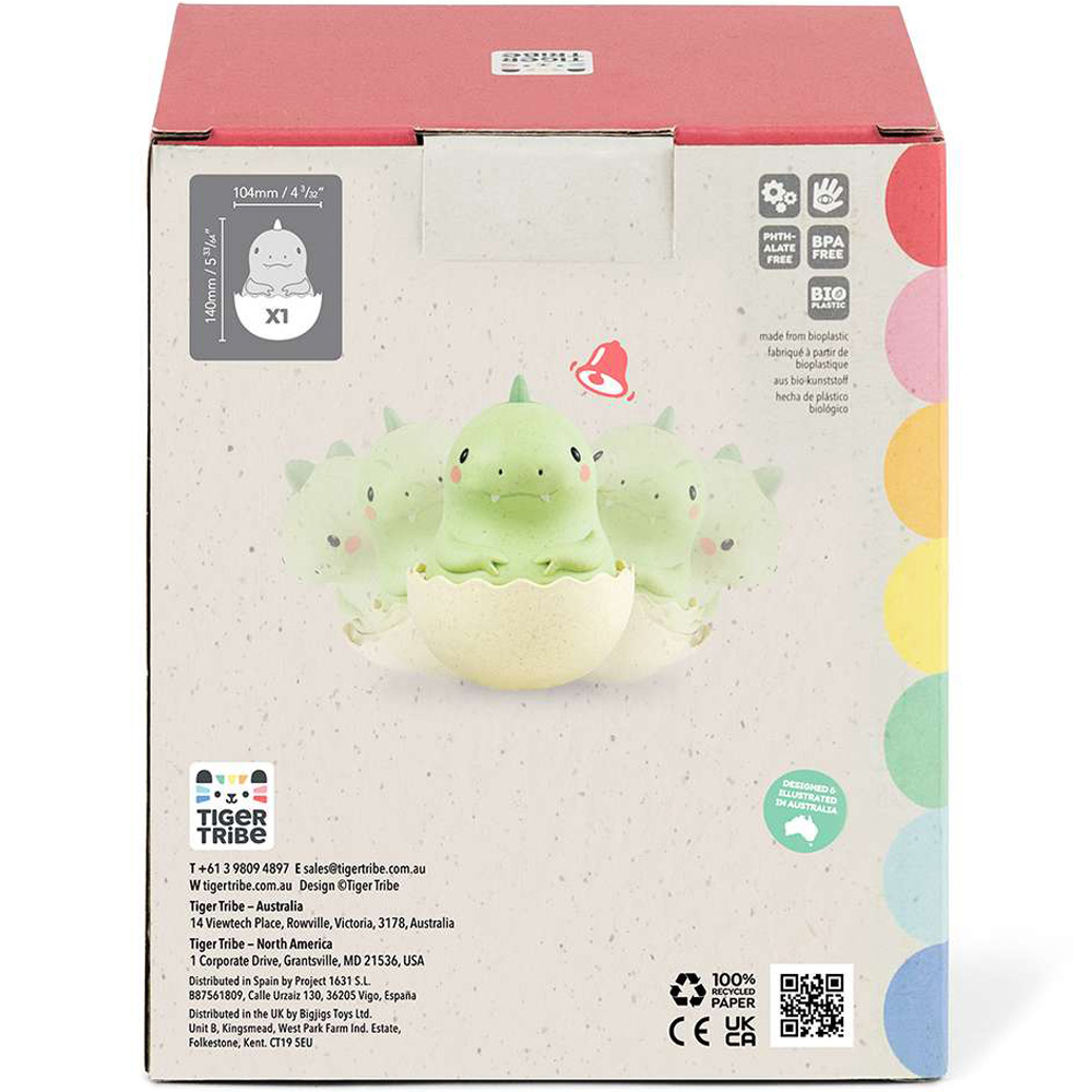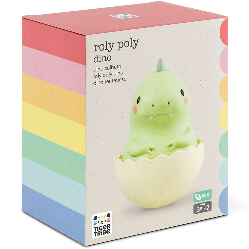 Motivate your cutie to start crawling with Tiger Tribe's Roly Poly-Dino! Push it, pull it, or tip it over and this rocking reptile will always bob back up for more. As the dinosaur rocks and rolls, you'll hear the soft sound of its gentle tinkling bell, while the grip points will give a little extra texture to explore. Tracking Roly Poly's side-to-side movements, listening to its bell, and discovering the different textures is a great way to stimulate babies' visual, tactile, and auditory senses. This playful dino will also help to boost your tiny tot's dexterity, gross motor skills, and cause-and-effect understanding. It is made from sustainable bioplastic and boxed in ethically sourced FSC-certified packaging. Suitable for 3+ months.