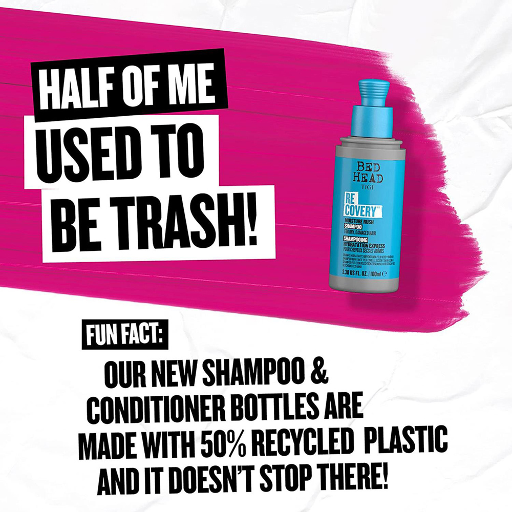 Bed Head By TIGI Mini Recovery Shampoo and Conditioner For Dry Hair Duo 100ml. Bed Head’s Recovery Shampoo, is new on the outside and just as epic on the inside. A rich moisturizing formulation, not only designed with but used by salon professionals. Delivering salon results and salon experience at home. Give moisture-deprived, dry hair a rush of hydration with the Bed Head’s Recovery Shampoo. With remarkable technology that helps moisturizing ingredients stay on the hair, hair is served with moisture benefits all day long. This moisturizing shampoo hydrates deeply cleanses and softens dry hair. The shampoo also helps to protect hair from future damage. Leaves hair shiny, soft, smooth, and looking healthy. This moisturising conditioner hydrate moisturises and conditions dry hair. The conditioner smooths and softens dry hair so hair is left moisturised, soft, frizz-free and healthy. Formulated with Silicones to boost softness and shine, Amodimethicone to smooth and soften hair and calm frizz, Dipropylene Glycol to condition and hydrate hair and Prickly Pear Cactus Extract, which is known for its healing properties.