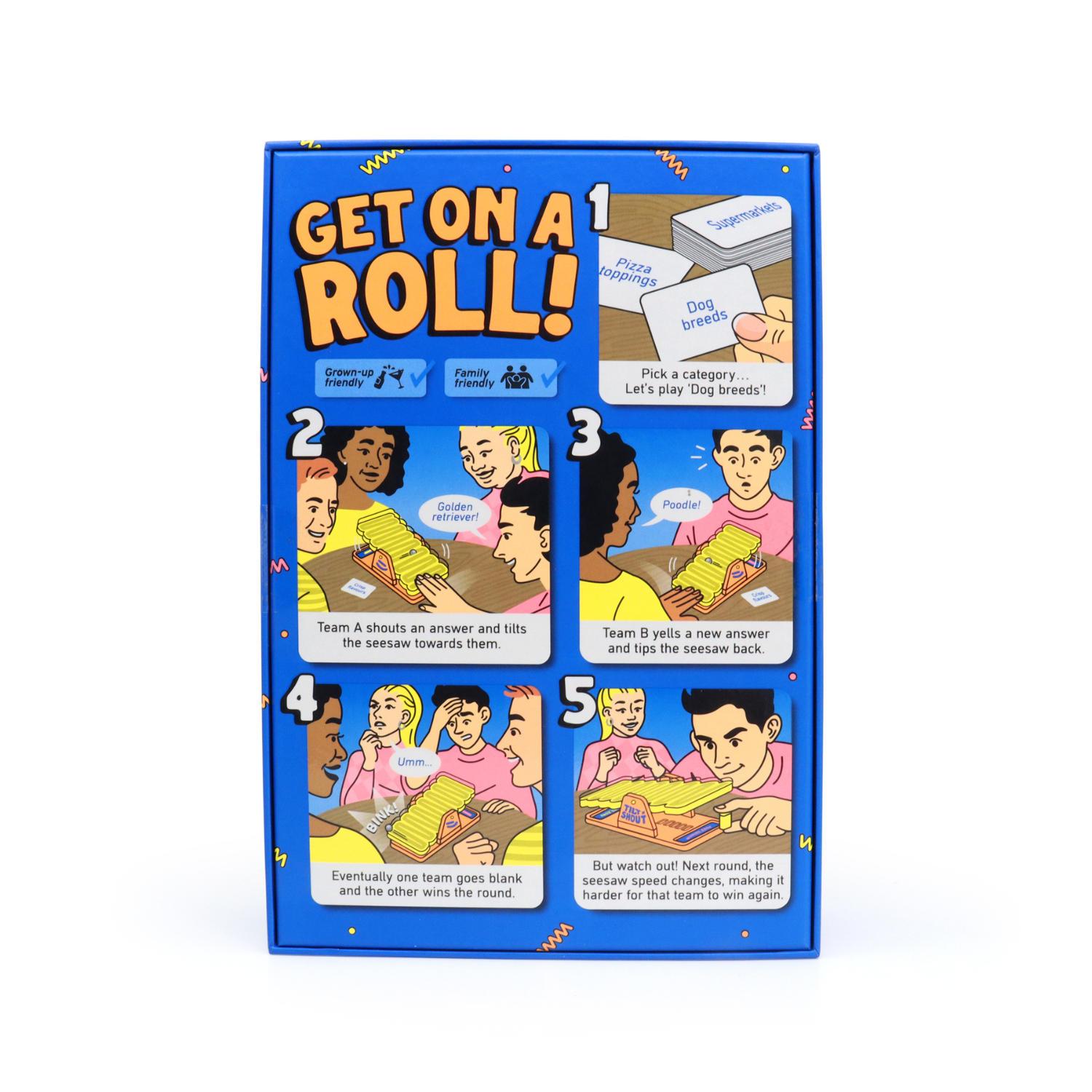Stay entertained with this fast-paced Tilt n Shout game, a back-and-forth battle of brains and speed where quick thinking and loud answers lead to victory. Each team takes turns shouting answers within the same category. If your team blanks out and the timer runs out, the other side snatches the ball and wins the round. Loud, chaotic, and wildly competitive, its sure to keep you thoroughly entertained.