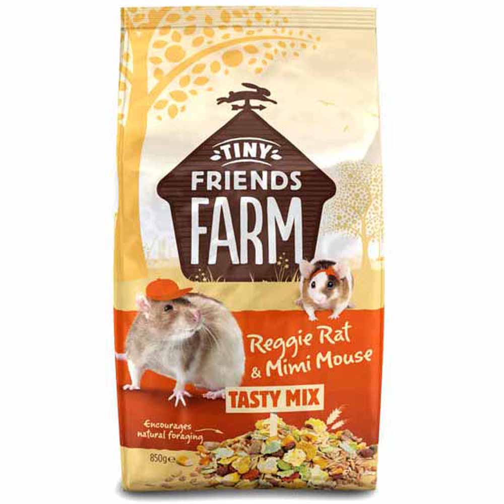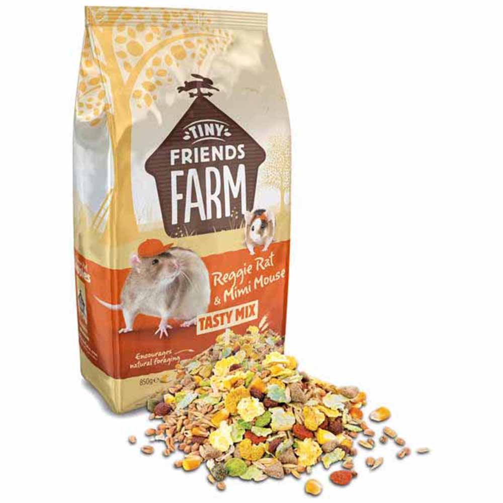 The Reggie Rat & Mimi Mouse Tasty Mix from Tiny Friends Farm is a nutritionally balanced treat that is suitable for rats and mice of all shapes and sizes. Enriched with delicious ingredients such as maize, oats, wheat and peas, as well as added vitamins, it provides a tasty everyday diet that helps promote your pet’s natural wellbeing, vitality and foraging. With added tasty linseed, the meal helps keep your pet’s skin and coat in the very best condition. No added sugar. Size: 850g.