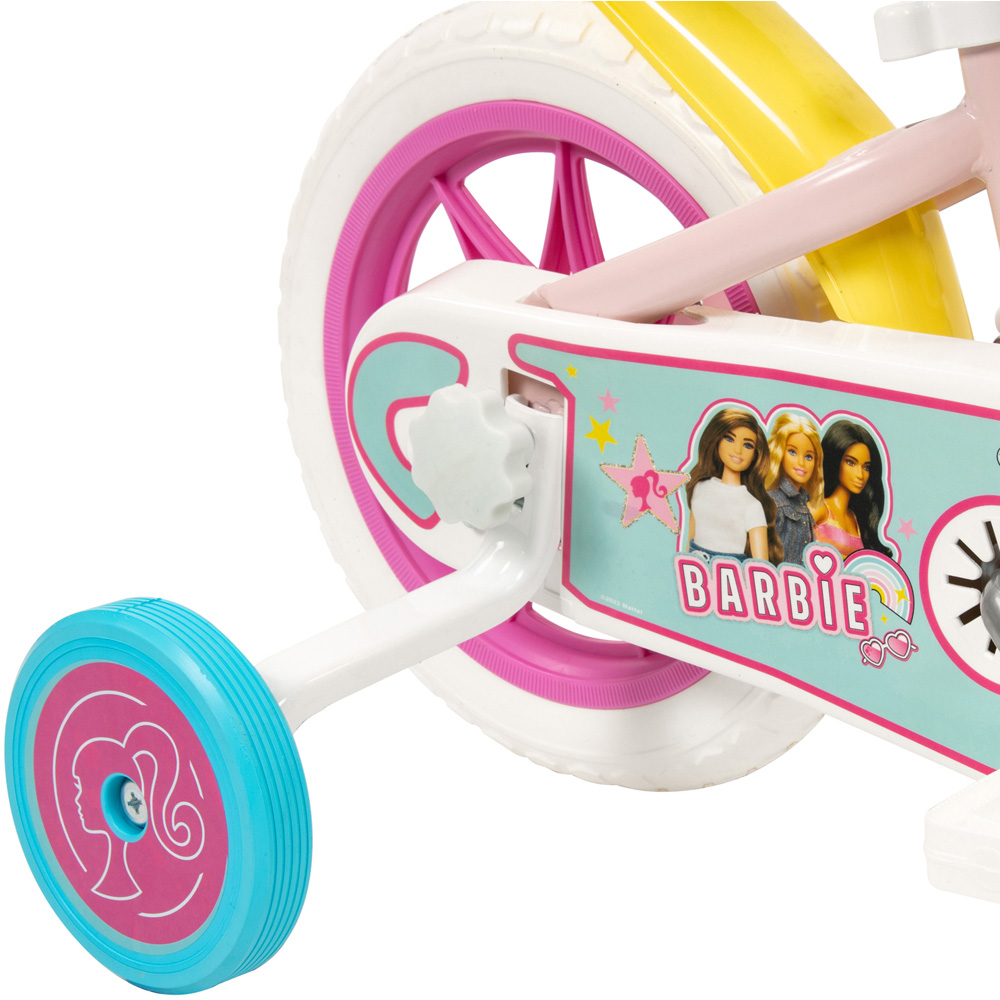 Get your little ones on an adventurous ride with this Toimsa 12 Inch Barbie Freewheeling Bicycle. The Barbie-licensed bicycle comes with a fixed rear wheel; so when the pedalling stops, the bike comes to a halt. Complete with a powerful V-type front brake, it features wheels with mudguards and puncture-proof EVA tyres and also comes with removable stabilisers. Designed with utmost convenience in mind, the bicycle comes with a height-adjustable saddle from 85 to 100cm and handlebars for added comfort as they grow. It also has a front shield and colourful Barbie decals to complete the look. Suitable for ages three to five years, it's a perfect bike to help children learn.