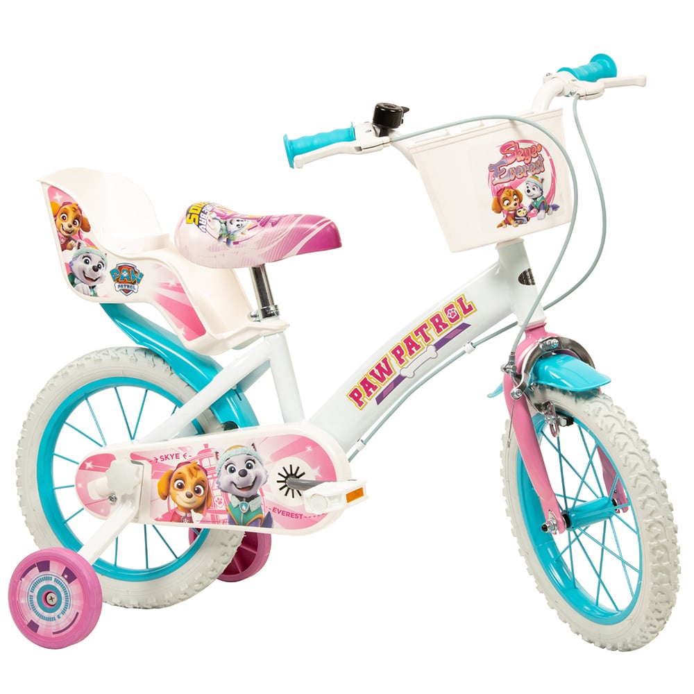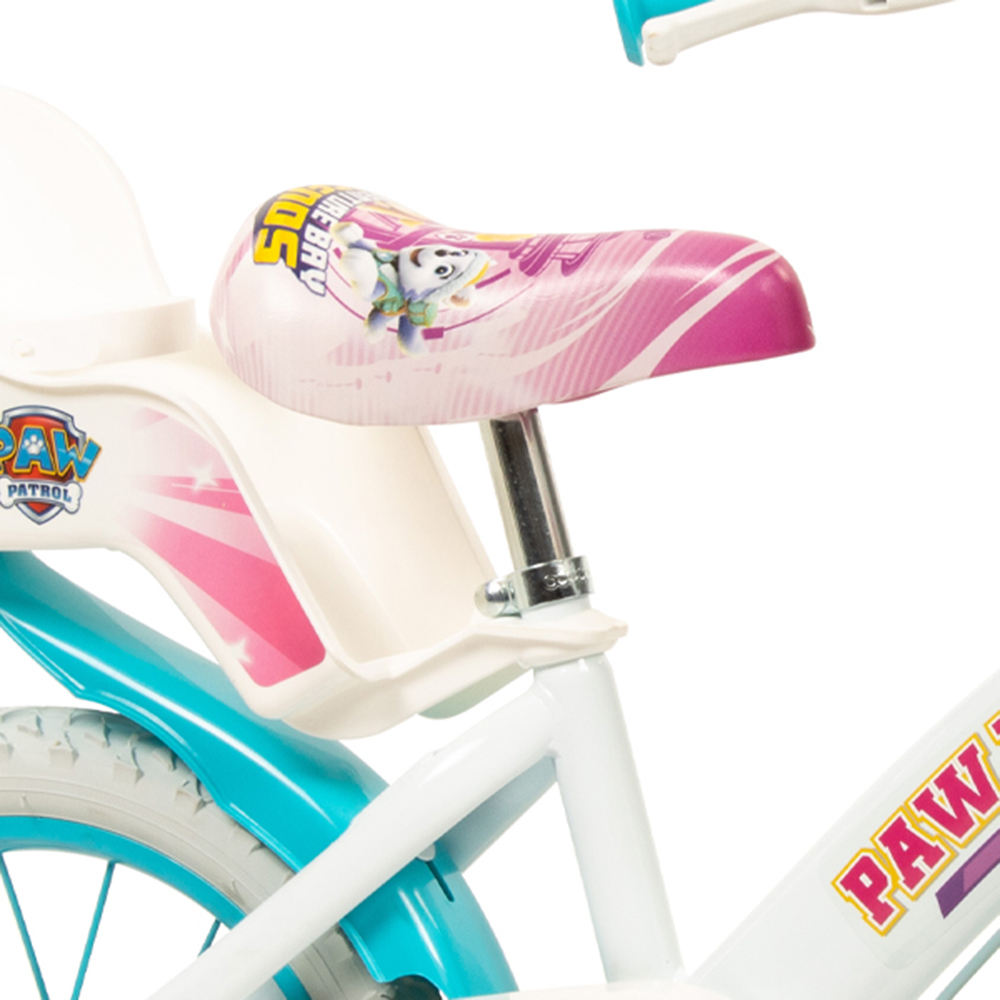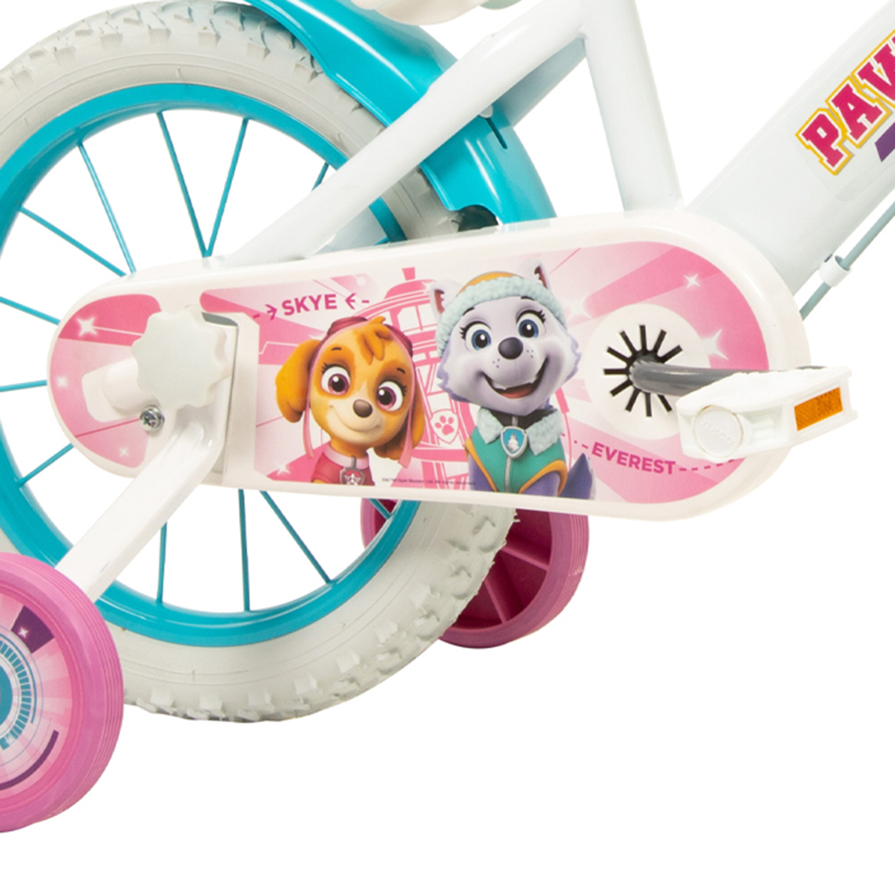 This freewheeling white Paw Patrol licensed bicycle comes with a front calliper brake and a rear drum brake, which offers optimum safety to young riders. It features 14-inch pneumatic tyres with spoked wheels with mudguards and also has removable stabilisers. The bicycle also comes with an adjustable saddle and handlebars as well as a rear doll carrier with strap, a front basket and colourful Paw Patrol decals, which makes it suitable for ages between four to six years. Suitable height range: 100-110cm.
