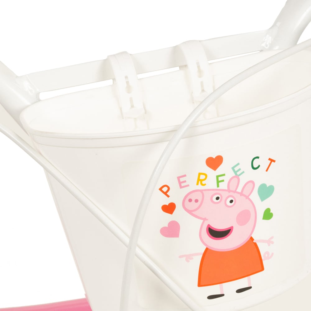 This freewheeling red Peppa Pig licensed bicycle comes with a front calliper brake and a rear drum brake, which offers optimum safety to young riders. It features 14-inch pneumatic tyres with spoked wheels with mudguards and also has removable stabilisers. The bicycle also comes with an adjustable saddle and handlebars as well as a rear doll carrier with strap, a front basket and colourful Peppa Pig decals, which makes it suitable for ages between four to six years. Suitable height range: 100-110cm.