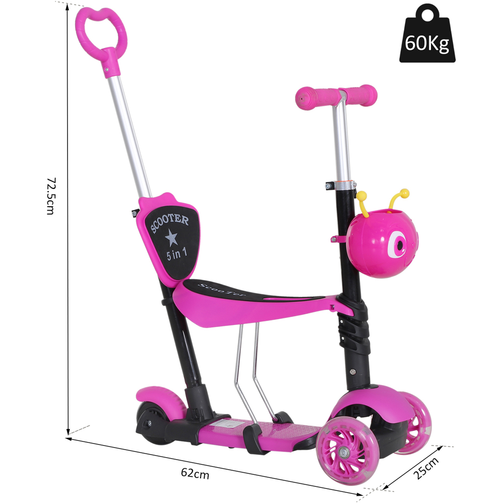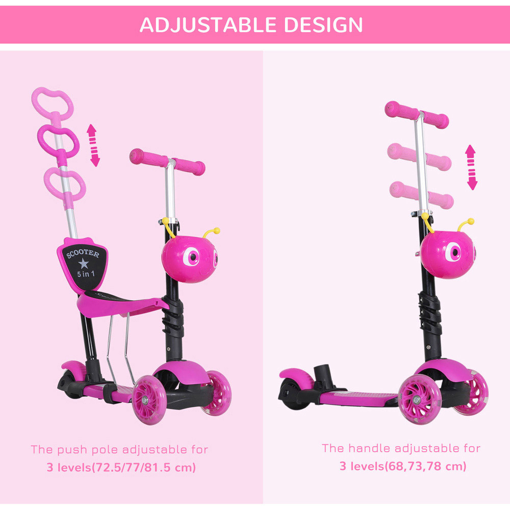 This 5 in 1 Pink Kids Kick Scooter from Tommy Toys is ideal for any growing child. With a removable seat and pushing handle, the scooter can be changed from a parent-controlled push scooter for younger kids to a fully independent scooter as they grow. The scooter has a three-level height adjustable pushing handle and handlebars to fit varied ages from one to eight years, so the child can have a comfortable and smooth progression. It also features lean-to-steer technology, which means the tilt of the body drives the scooter to steer. This design helps your child develop balance ability, coordination and more. It is made from a reinforced aluminium alloy frame to ensure strength and stability. It also has an animal-shaped basket in the front for your children to keep their snacks or toys while they play. This is a great scooter for any child to enjoy unlimited fun in riding.