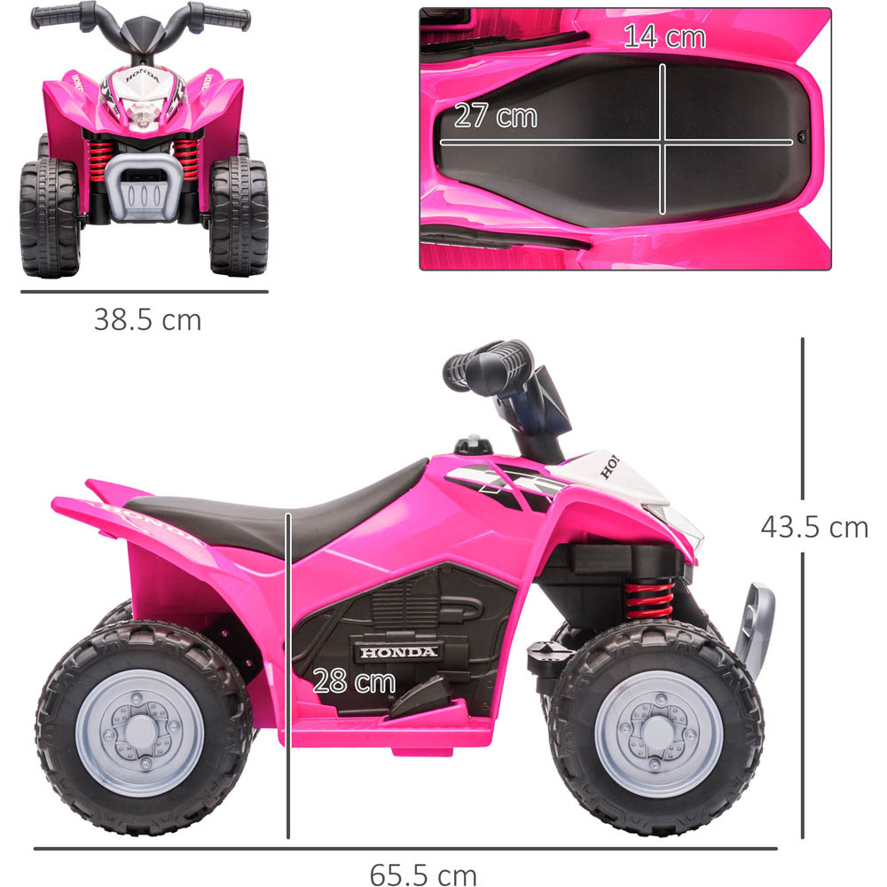 Provide endless fun for children with this officially licensed Honda Pink Ride On Electric Quad Bike from Tommy Toys. It features LED headlights, a horn and a foot pedal for a realistic driving experience. It also has four wide wheels that keep the ride secure and smooth, whilst they sit on a comfortable seat and grip the soft handlebars. Featuring a powerful 6V motor with a rechargeable battery, this ride-on lasts for 45 minutes at full charge and its maximum speed is 2.8km per hour, making it safe and appropriate for small children. Plus, the quad bike is made with metal and plastic, making it solid, durable and suitable for daily use. A great way to make playtime extra exciting. Suitable for ages from 18 to 36 months.