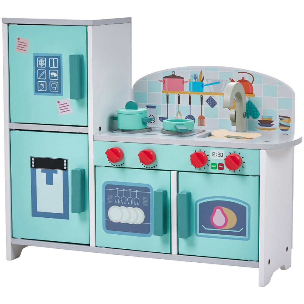 Spark a kid's culinary imagination with this wooden play kitchen set. Made from solid wood with eco-friendly paints, this kitchen is built to last, offering a safe and fun environment for creative play. Featuring a gas cooktop, a sink, an oven, a fridge, a dishwasher, and a water dispenser, it brings the joy of cooking right into the home. Functional knobs and handles add to the hands-on fun, making it perfect for little chefs who want to learn and play. Its realistic design allows for endless role-play fun, and the storage options make cleanup simple and enjoyable.