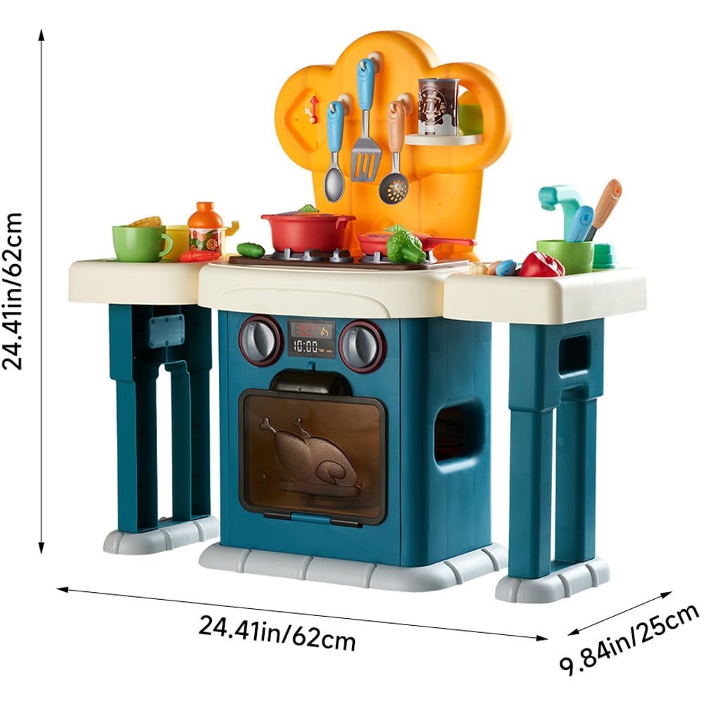Let a little one explore the joy of cooking with this interactive kitchen playset. Featuring two cooking stoves with light and sound effects, a sink, and a prep table, this set offers a realistic kitchen experience. The oven with a door allows the kid to play chef and bake delicious treats. A variety of kitchen accessories are also included to spark creativity and imaginative play while helping the kid practice organizing and coordinating tasks. The side table can be folded to save space, and the sturdy base helps the set stand steadily, making it a perfect gift idea for kids who like cooking.