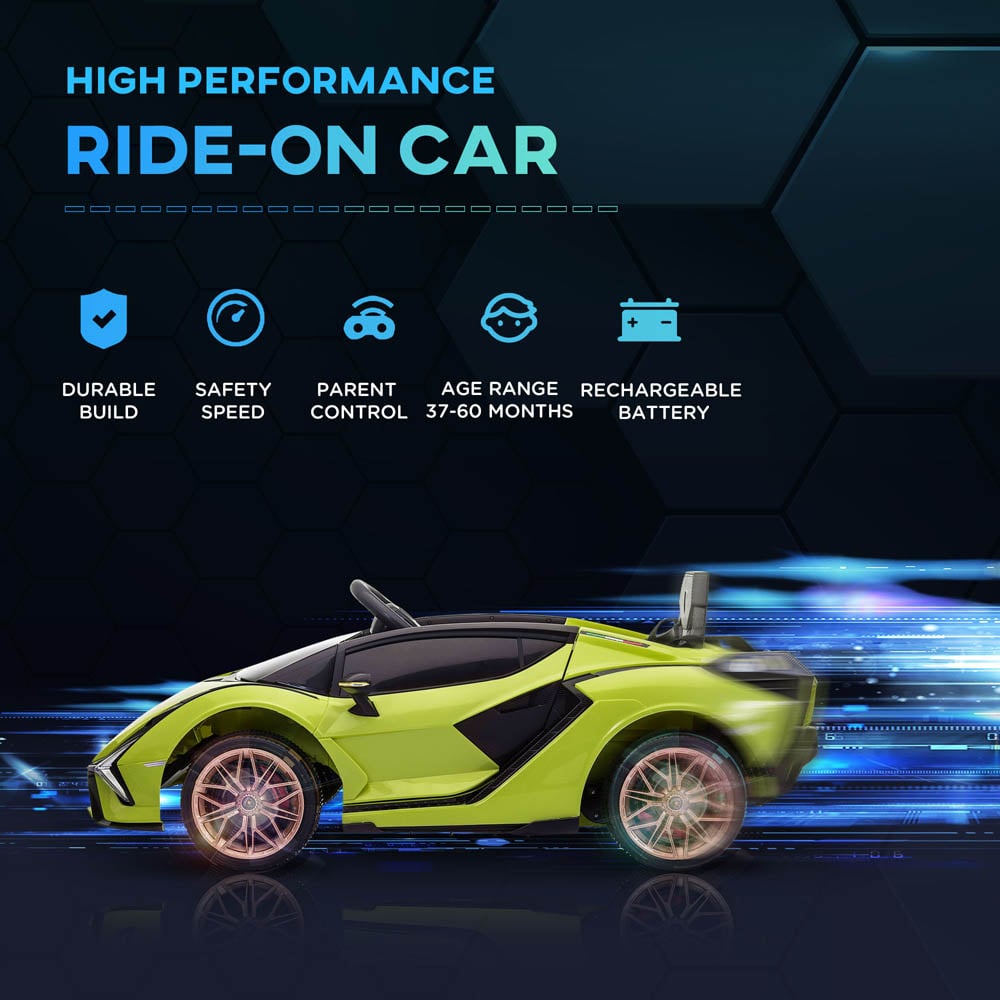 Fun and safe driving for children starts with the Tommy Toys Lamborghini Sian Kids Ride-On Electric Car in green. This cool officially licensed Lamborghini Sian is a super cool addition to your child's toy collection. Packed with functions, it features working headlights and tail lights, a steering wheel, movement pedals and a music player. Ensuring safety, the wide tyres offer a smooth ride, and the car includes a seatbelt for protection. Also, the dual motor structure gives more power with a maximum speed of 8km/h. Plus, it is simple to transport while the vehicle is without power, thanks to the handle attachment and auxiliary wheels. This ride-on car is powered by a 12V rechargeable battery. Suitable for three to five-year-olds.